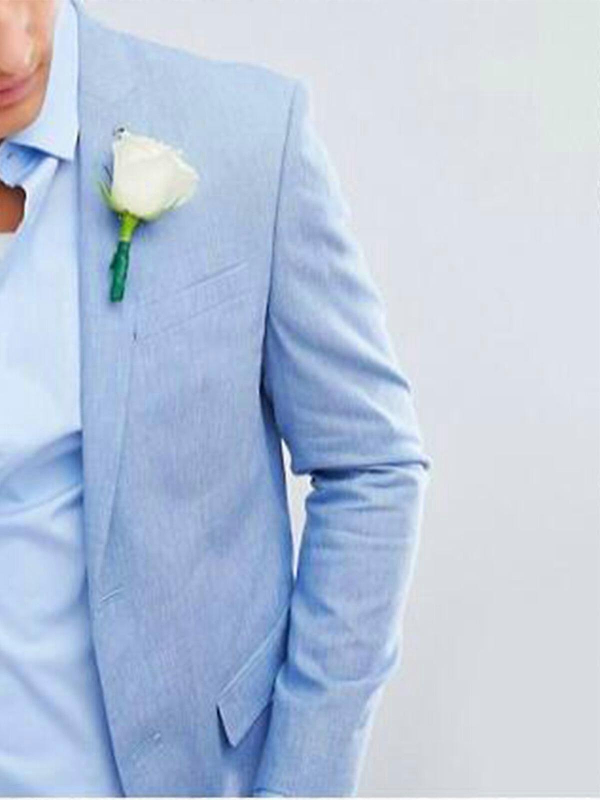 Fashion Sky Blue Linen Suits Men Tailored Slim Fit Light Weight Linen Groom Suit