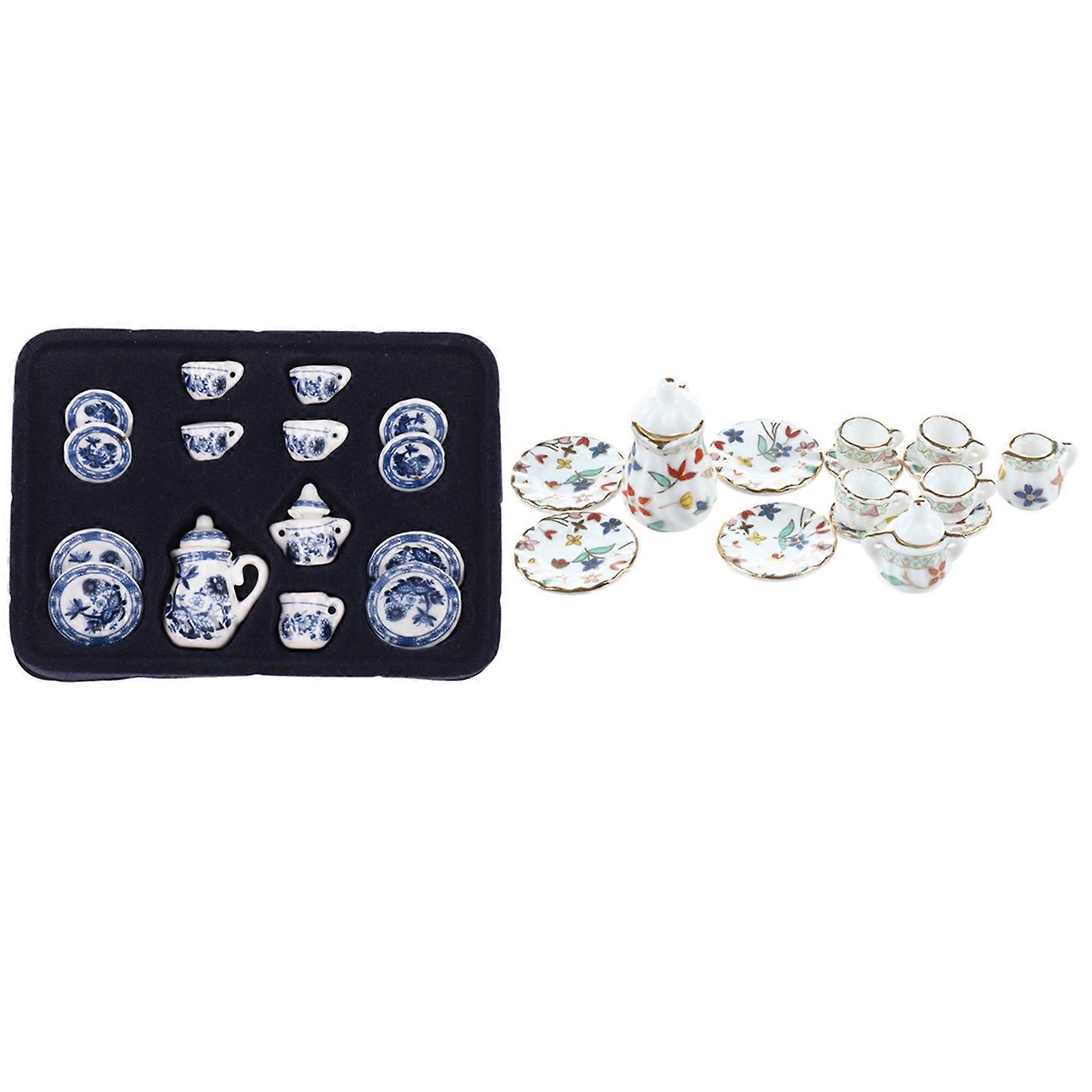 2set Miniature Dollhouse Dinnerware Porcelain Tea Set Tableware Cup Plate Colorful Floral Print & Blue Flower