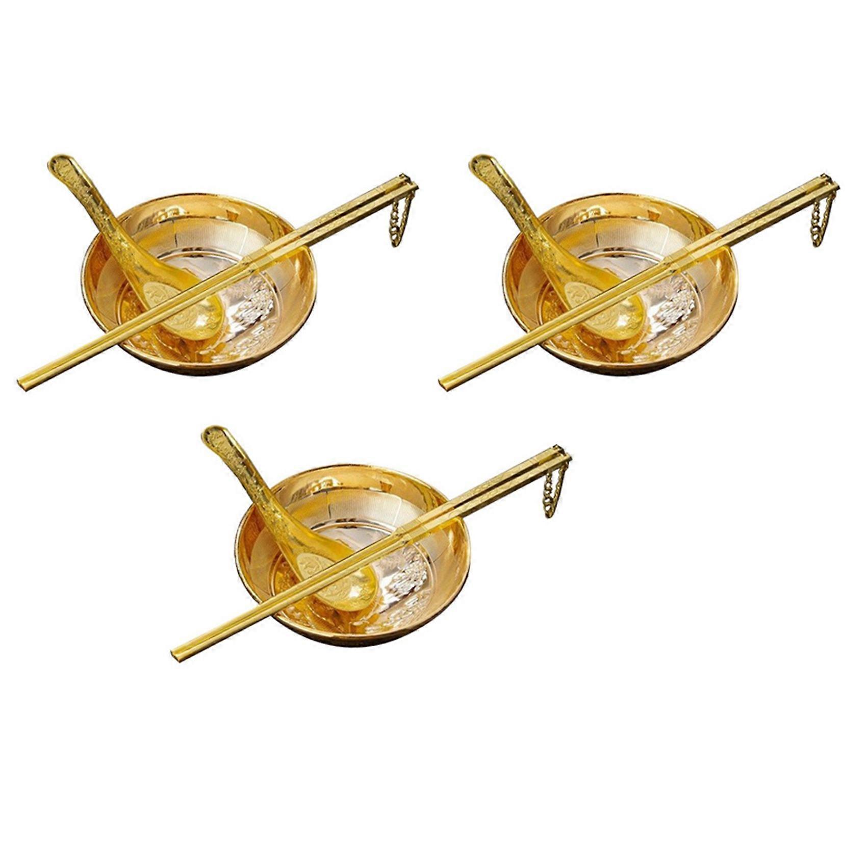 The whole is bright and delicate, and the surface pattern is unique. Colour: gold Material: zinc alloy Package Contents: 3 x golden bowl 3 pair x golden chopsticks 3 x golden spoon
