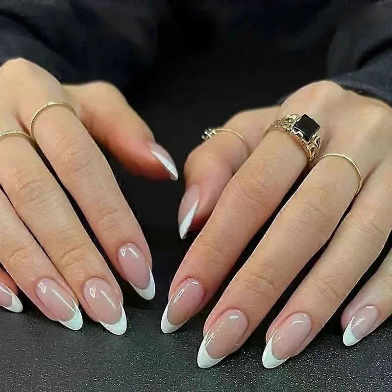 24Pcs French False Nails Almond Fake Nails with Glue Press on White Edge Design Wearable Simple Ins Pink Stiletto Nail Tips