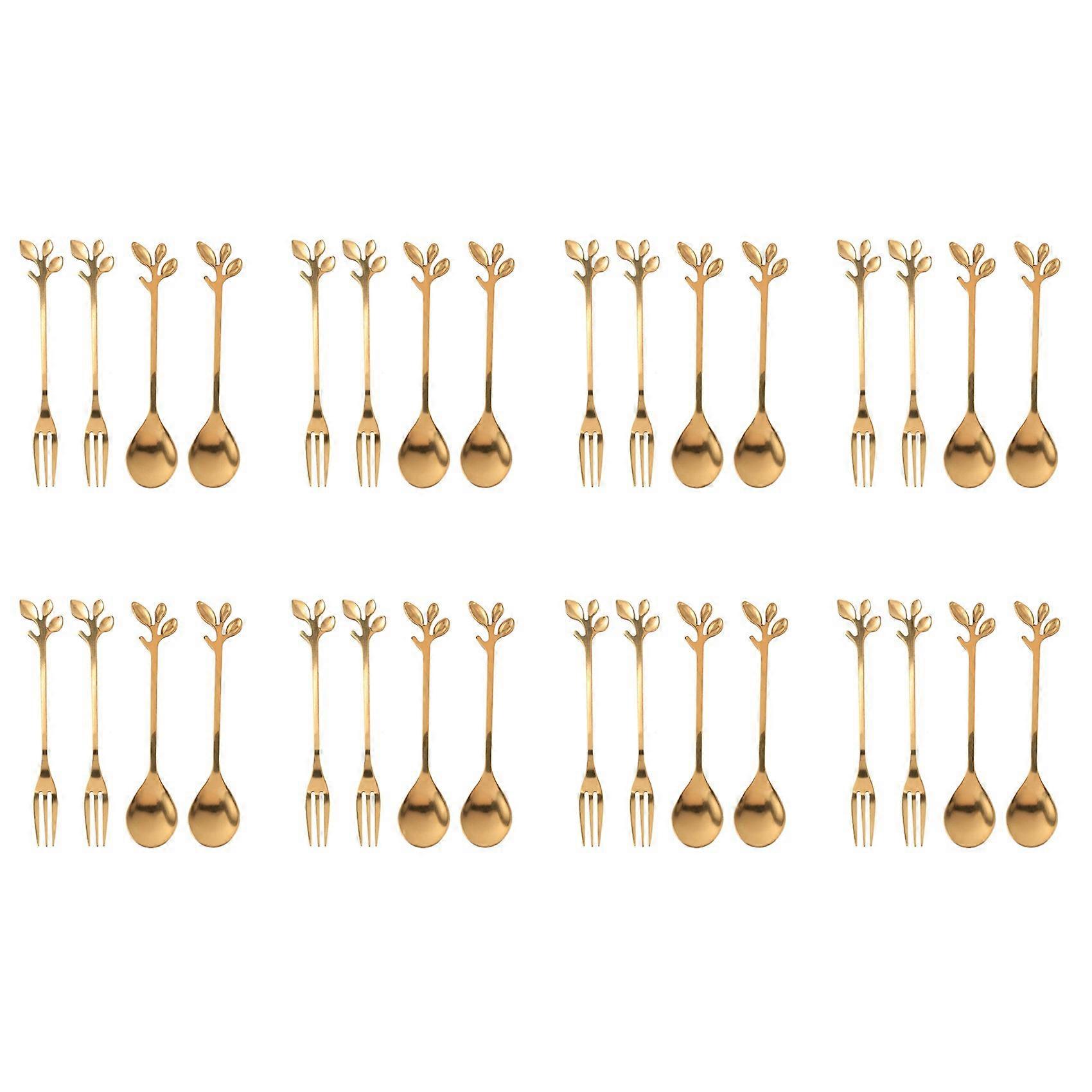 Tableware Gold Leaf Coffee Spoon Fork,32 Pack(16 Spoons 16 Forks) Little Demitasse Espresso Spoon,4.7 Inches