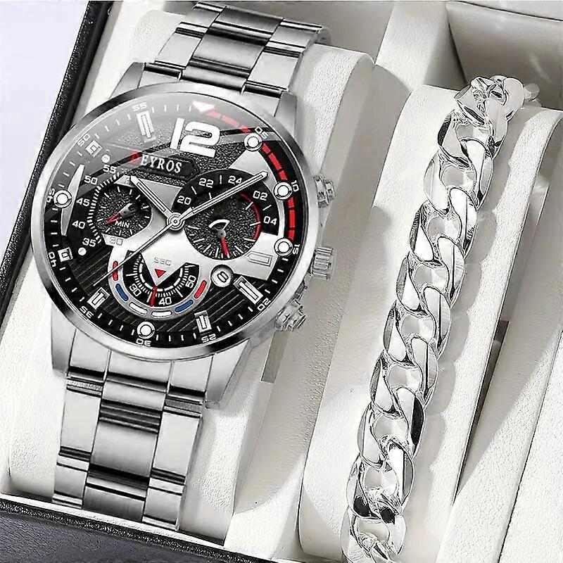 2pcs Luxury Mens Silver Quartz Watch With Stainless Steel Bracelet Men Fashion Business Casual Watch Luminous Clock