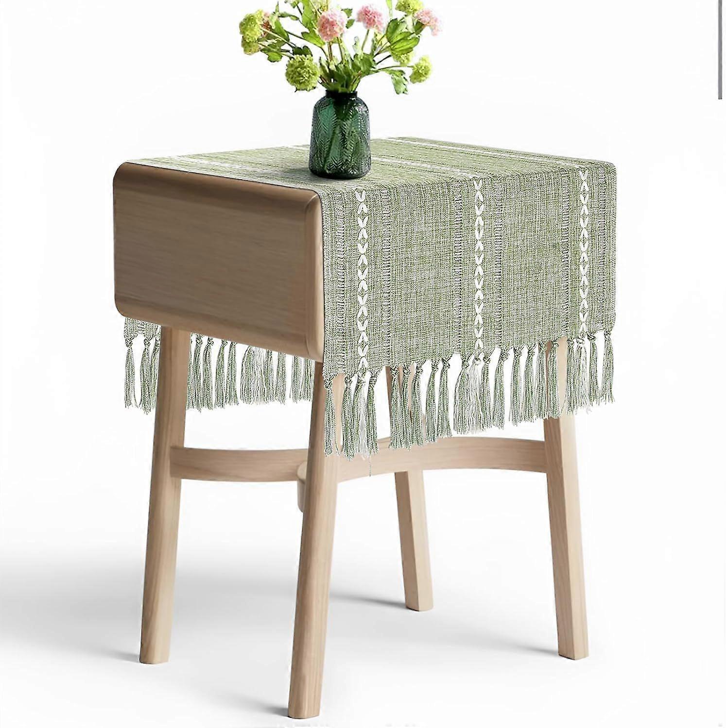 Cotton, LinenSmall TableclothThe short table cover is 15.7 x 36 inches long (15.7x44 inch with tassels) . Great for daily use, holiday, family gathering, special occasions, and much more. It can give your tables a rustic and boho look, making it a four-season home decor.Boho Home DecorThis sage green table runner short is a great accent piece for more places than your dining room table. Try this green tablecloth on an entryway, top of a dresser, nightstand, end table, console, book desk, bookshelf, storage table, piano top, TV stand, picnic table, office desk, dressing table or as a coffee table runner, dining room decor, bedroom decor.Wide OccasionFarmhouse tablecloth is a good choice to your modern farmhouse home decor, also a good decoration for weddings, partys, bridal shower, baby shower, daily use, birthday and more life events. The table runner can be a gift for your family or friends for holiday, mother's day and birthday.Boho Table Runner ShortThe bedside table cover is made of cotton linen, with handmade tassel designed, high density, soft, comfortable. This green nightstand table cover effectively prevents furniture from scratching.Wash TipsSuitable for both hand and machine wash, tumble dried on low or hung to dry. To achieve a better drop effect, measure the size of your table and consider adding at least 20 inches (10 inches on each side) when selecting the green table runner.