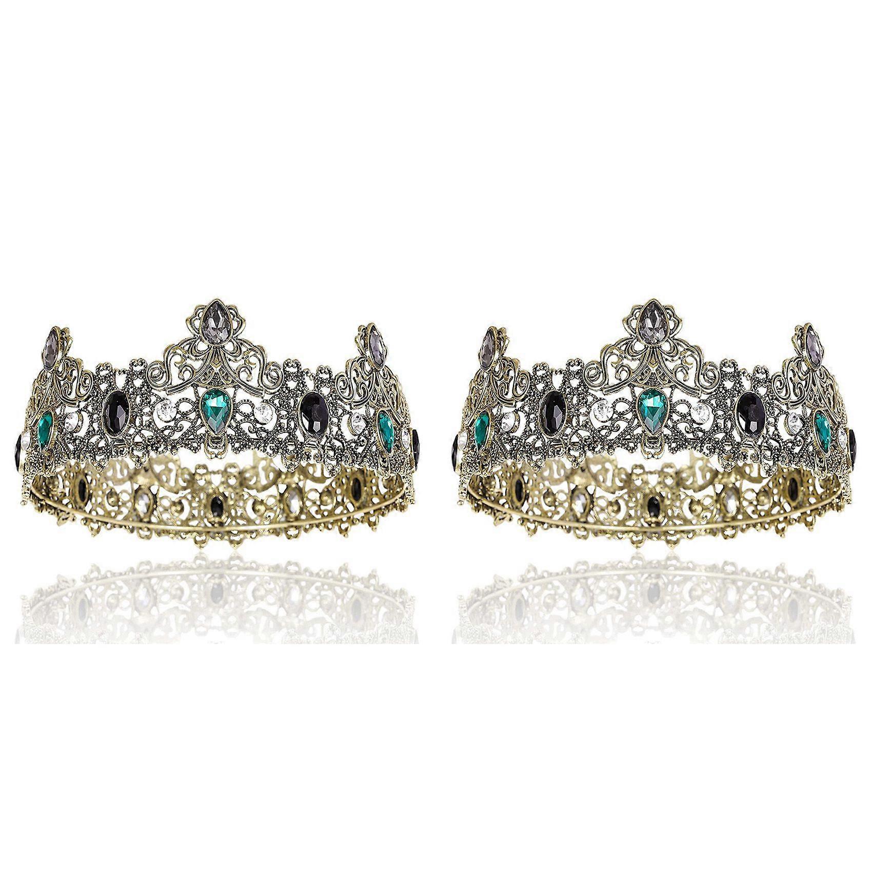 2X King Crowns for Men Metal, Vintage Full Royal King Crowns with Green Rhinestone, Men'S Birthday Tiaras