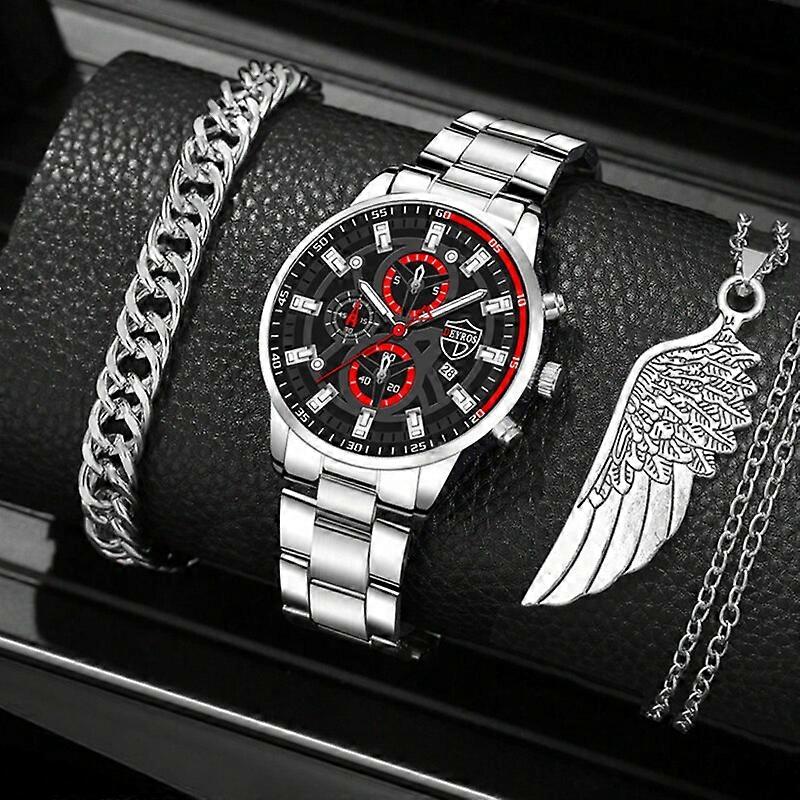 3PCS Set Fashion Luxury Mens Calendar Watches Male Casual Silver Quartz Watch Men Necklace Bracelet Wrist Watch