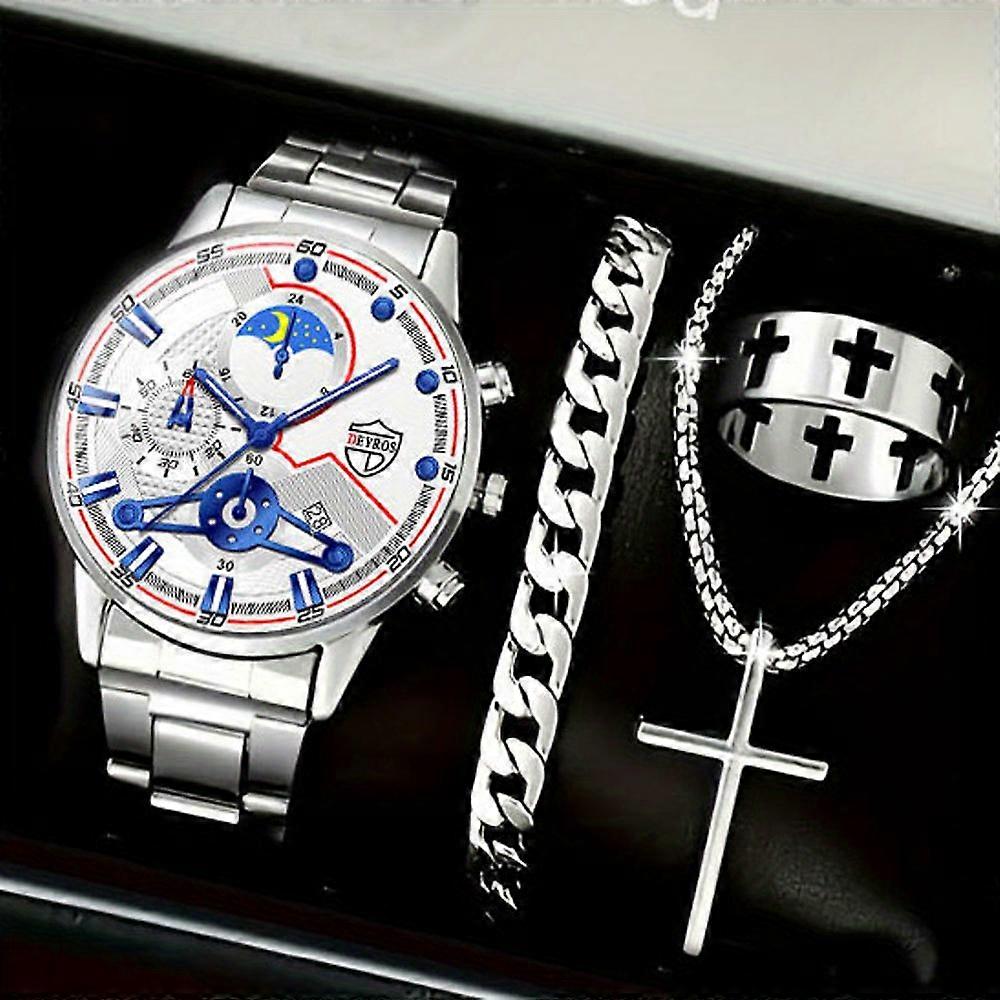 4 PCS/set Men's Fashion Watch Set Date Men's Quartz Watch Round Dial Alloy Case Watch Necklace Bracelet and Ring For Daily Wear