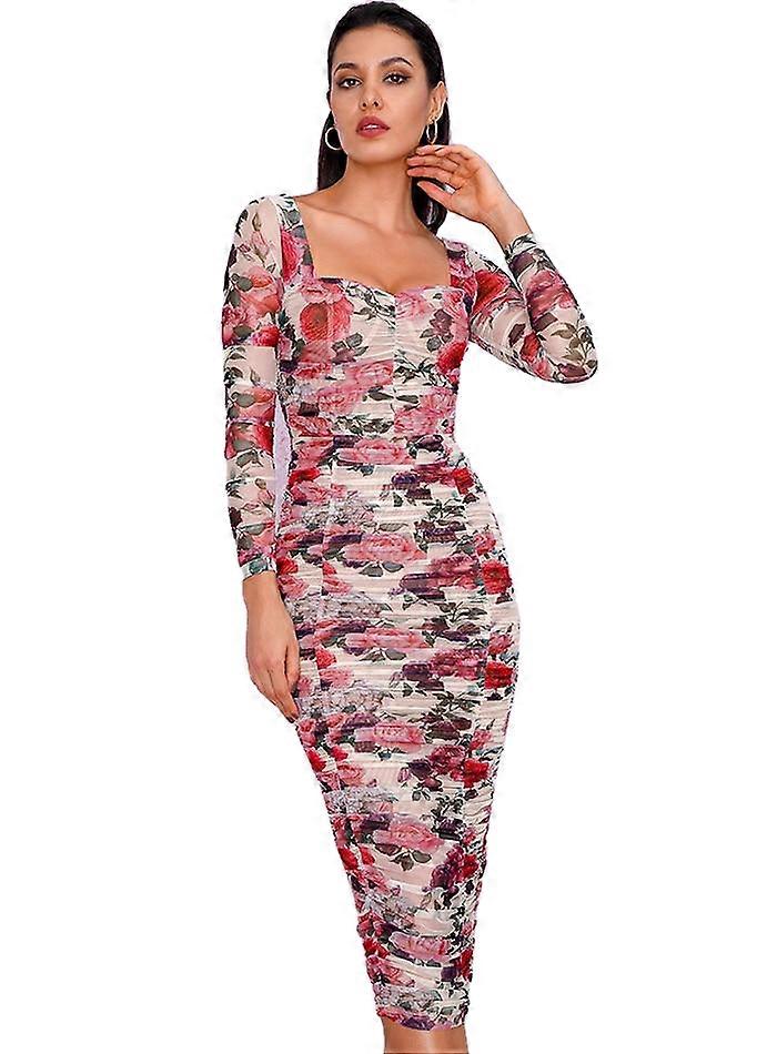 Sexy Floral Print Long Sleeve Over-the-knee Slim Mesh Party Dress With Lining