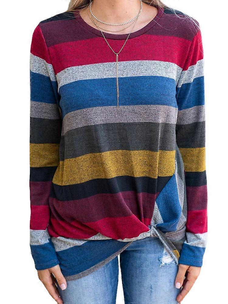 Women Multi-color Striped O-neck Twist Hem Long Sleeve T-shirt