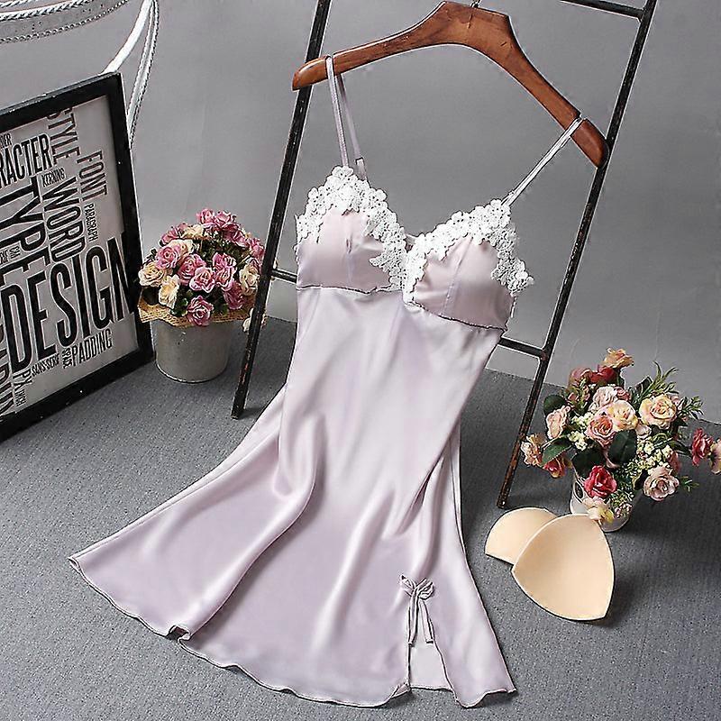 Ladies Sexy Nightdress Silk V-neck Floral Sleepwear Lingerie Babydoll Nightgown Mini Sleeveless Women Sleepshirt With Padded Bra Gender: Women Item Type: Nightgowns Material: Rayon,Polyester Sleeve Length(cm): Sleeveless Pattern Type: Floral Dresses Length: Above Knee, Mini Collar: V-Neck Material Composition: Polyester Season: summer Decoration: Appliques Color: Pink,Purple,Silver Gray,Blue,Red,Black Size: M,L,XL,XXL