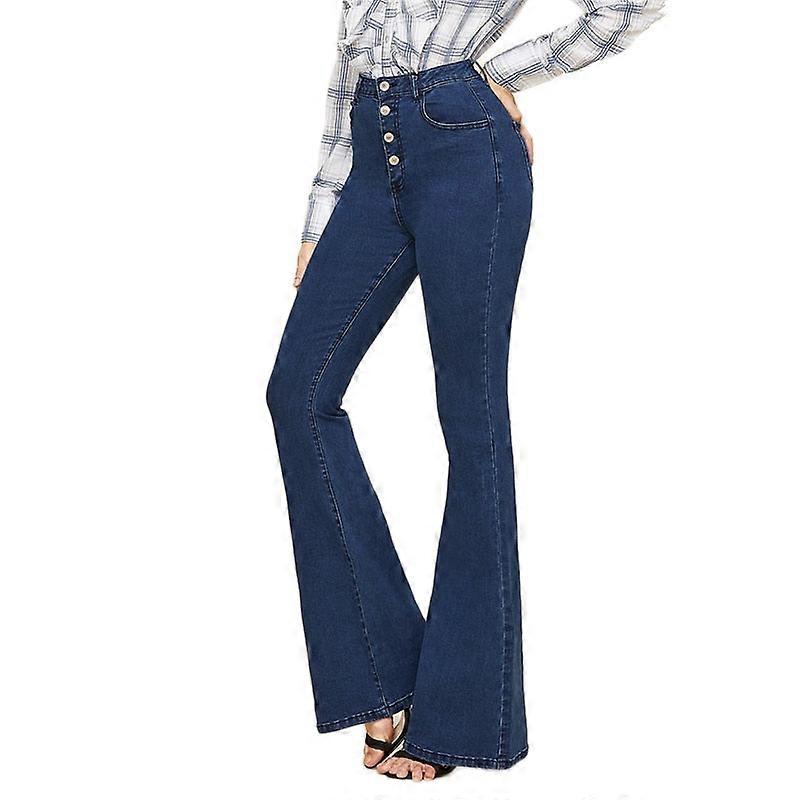 Vintage Ladies' Stretch Mid Waist Button-up Flared Denim Jeans Blue