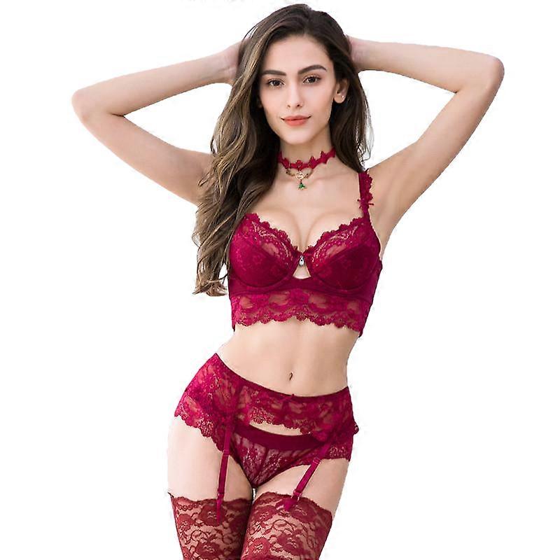 Burgundy Sexy Ladies' Lace Push Up Bra+panties+garter+stockings+necklace
