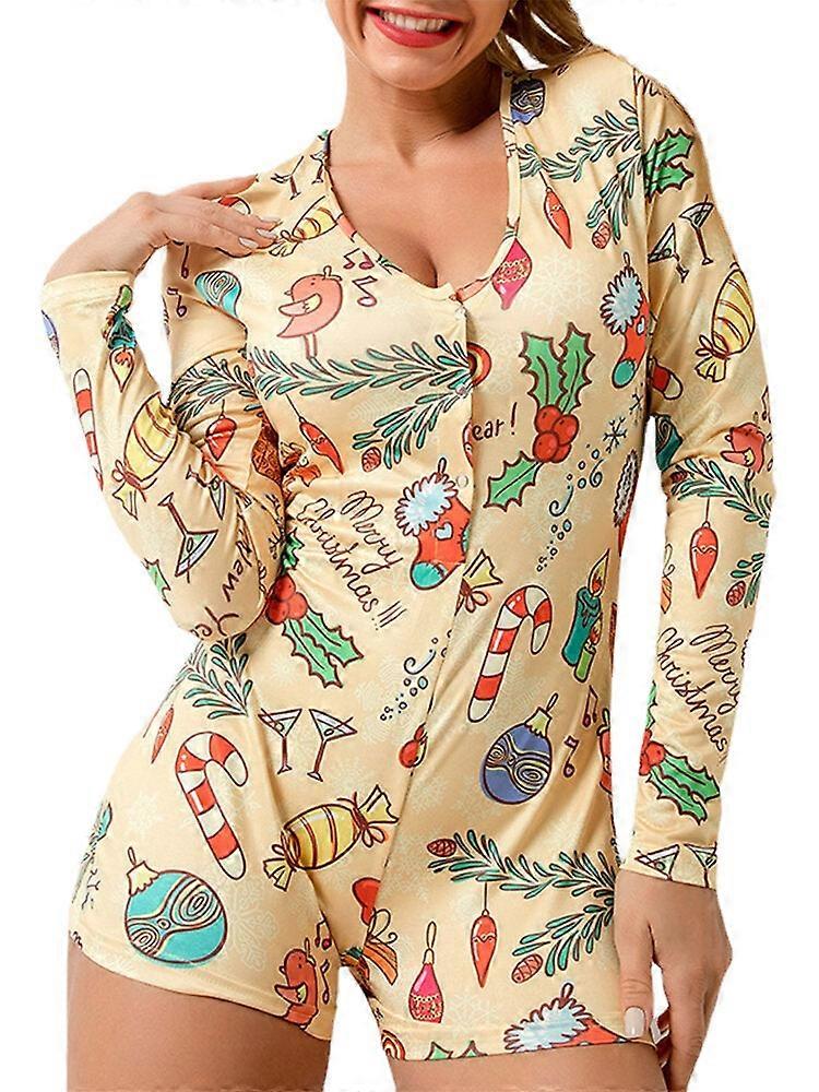 Plus Size Women Cartoon Print V-neck Long Sleeve Onesies Home Sleepwear Rompers