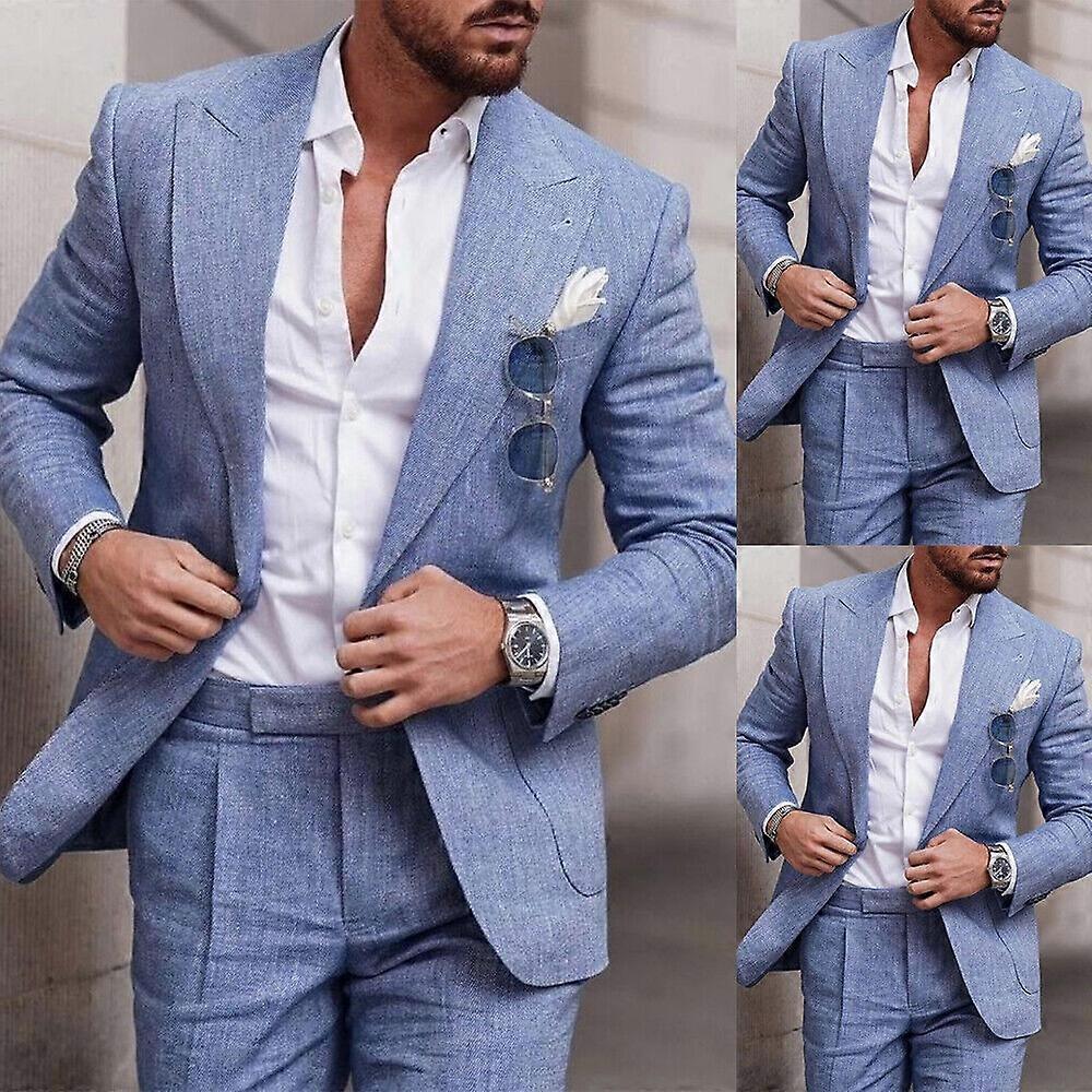 Blue Linen Men's Suits Summer Casual Business Peak Lapel Wedding Groom Blazer