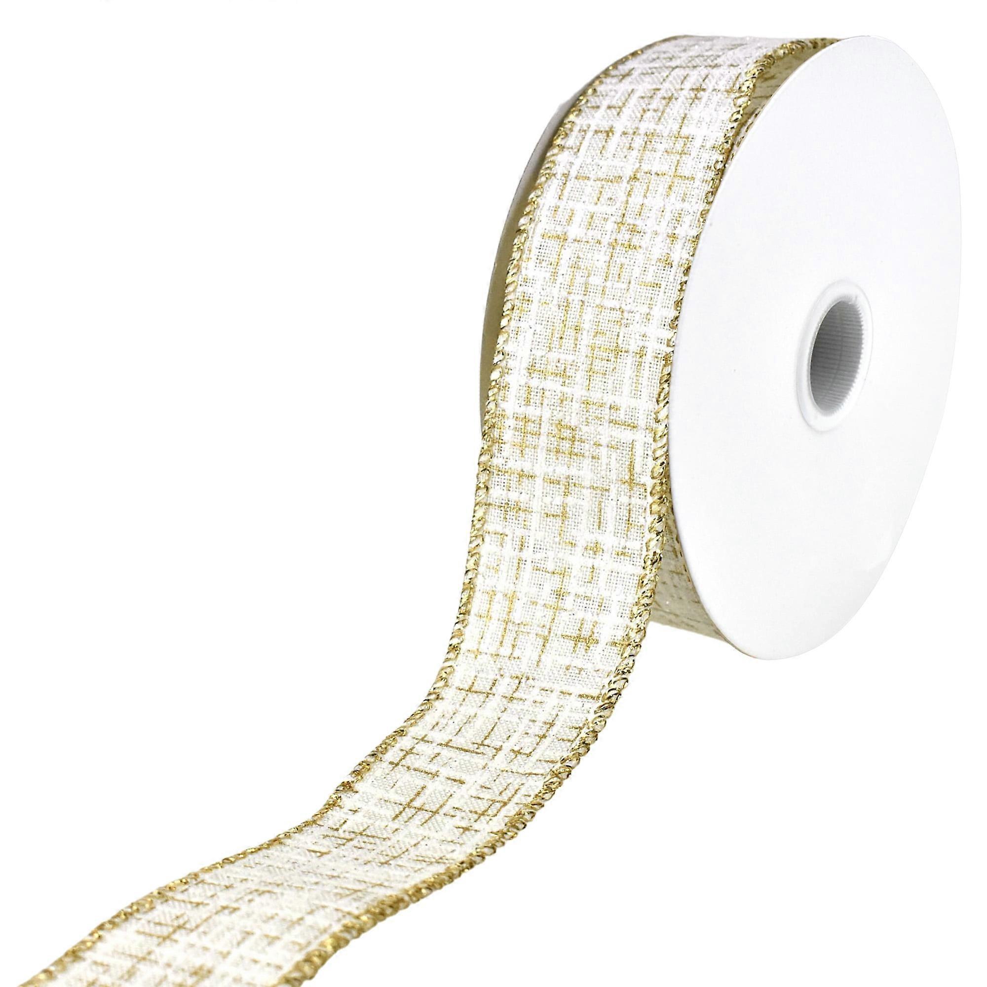Homeford Elegant Striped Texture Faux Linen Wired Ribbon, 1-1/2-inch, 10-yard, Ivory/Gold