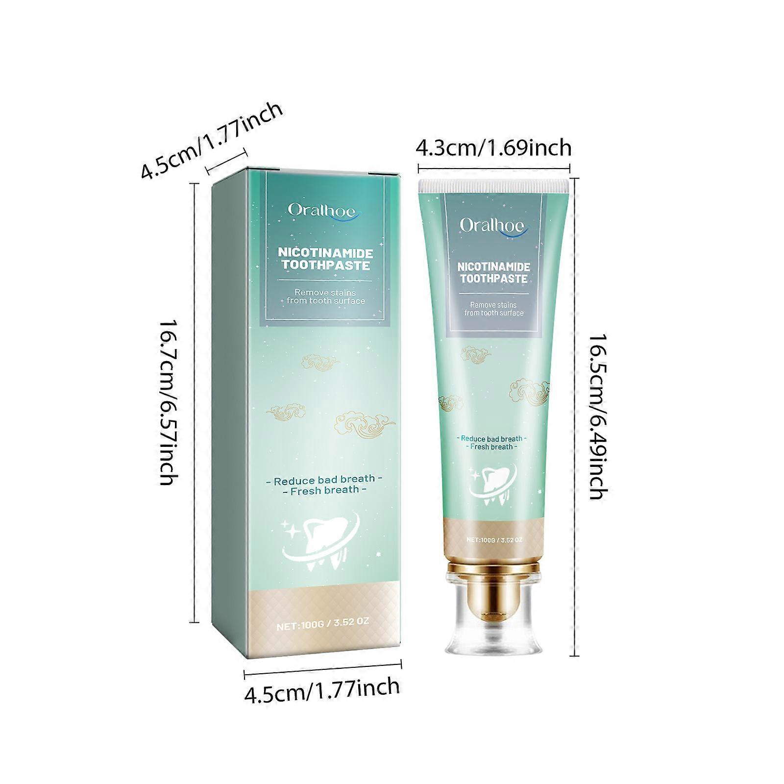 High-concerned chemical : None<br>Model Number : Niacinamide Toothpaste<br>Ingredient : Niacinamide, Peppermint Leaf Extract<br>Quantity : 1/2/3/5PCS<br>NET WT : 100g<br>Brand Name : Oralhoe<br>Origin : Mainland China<br>Number of Pieces : One Unit<br>Age : adults<br>Item Type : Toothpaste<br>Shelf life : 3 years<br>Features 1 : Helps whiten teeth<br>Features 2 : Effectively freshens breath<br>Features 3 : Deep cleaning teeth<br>Features 4 : Helps improve gum health<br>Features 5 : Protect tooth enamel<br>