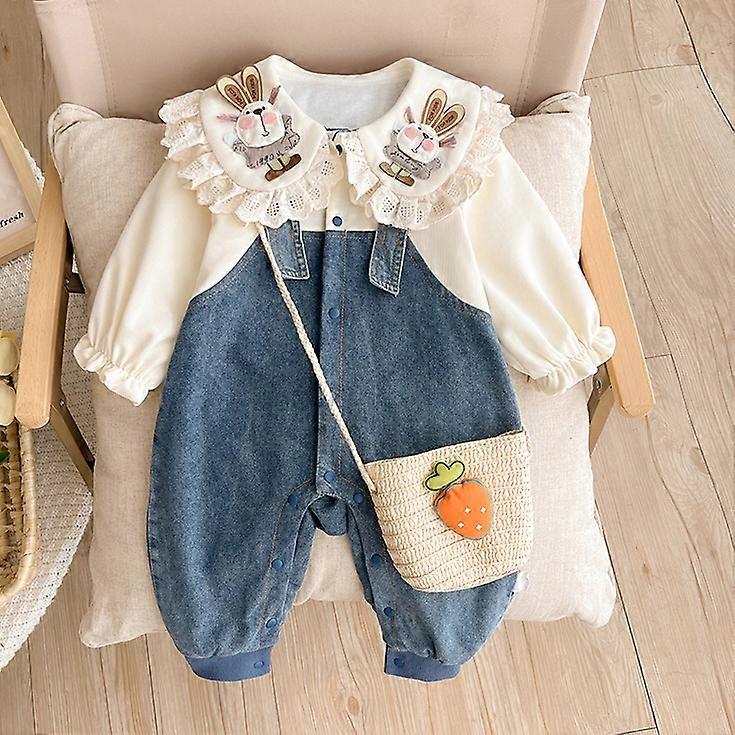 New Spring Autumn Baby Girl Rompers Lace Doll Collar Cartoon Rabbit Patchwork Denim Jumpsuit Newborn Hundred Days Clothes E2385