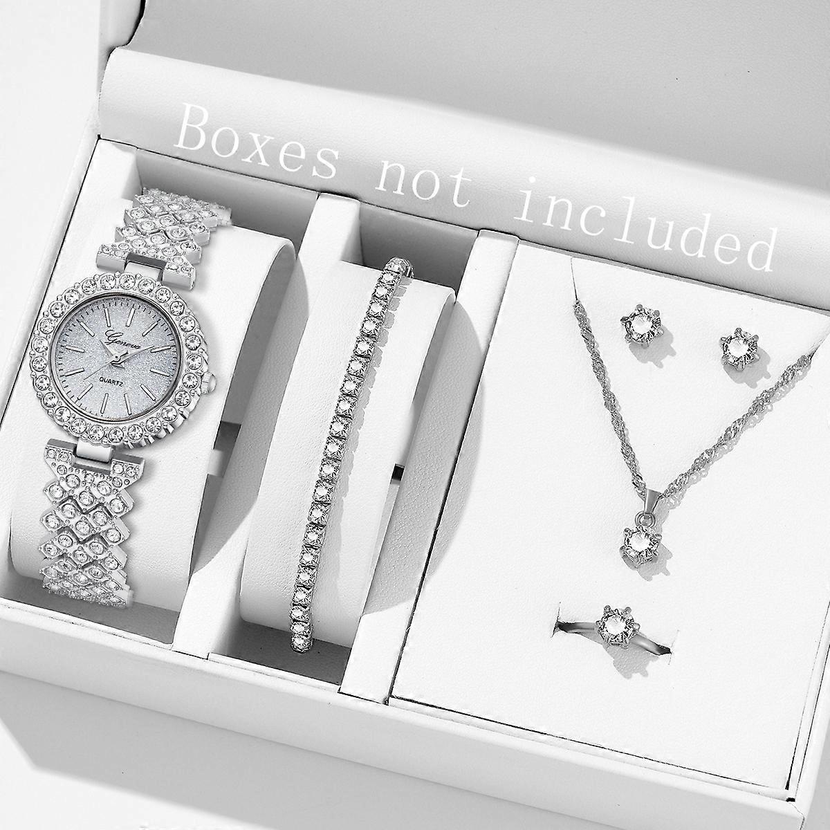 6PCS Silver Women's Watch Set Luxury Fashion Quartz Watch Bracelet Necklace Earrings Set Perfect Gift for Friends or Moms