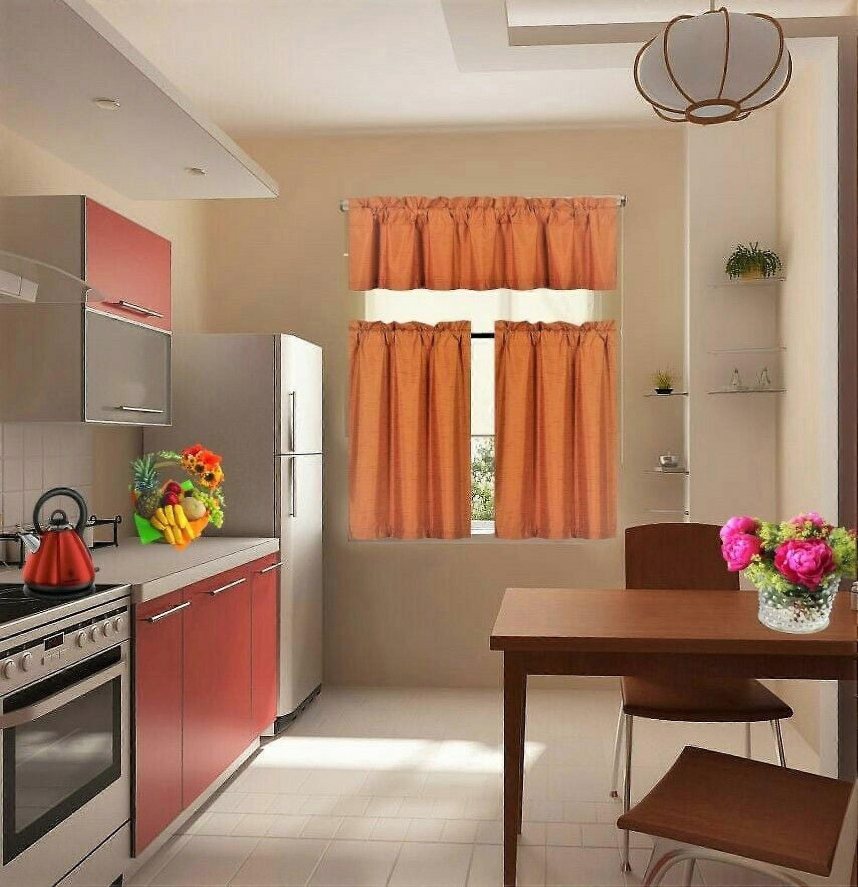 Set of 3 Kitchen Curtains Blackout K33 Brick, Rod Pocket, 2 Tier Panels + 1 Valance, Linen, compatible with Bathroom Short Window