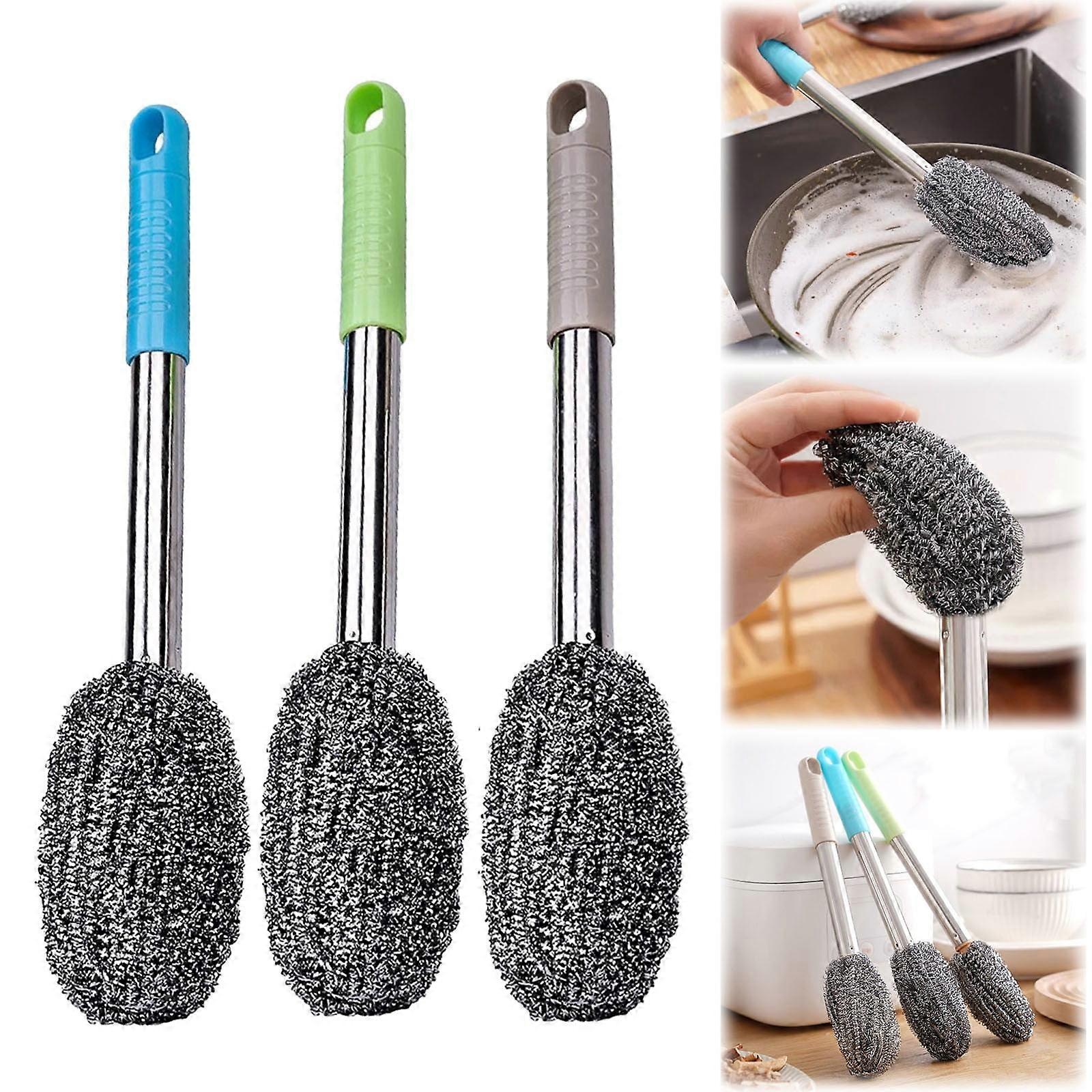 3 PCS Stainless Steel Sponge Scrubbing Scouring Pad Long Handle Design Built-in Spring Pot Pan Steel Wool Scrubber Bathroom Accessories Random Color