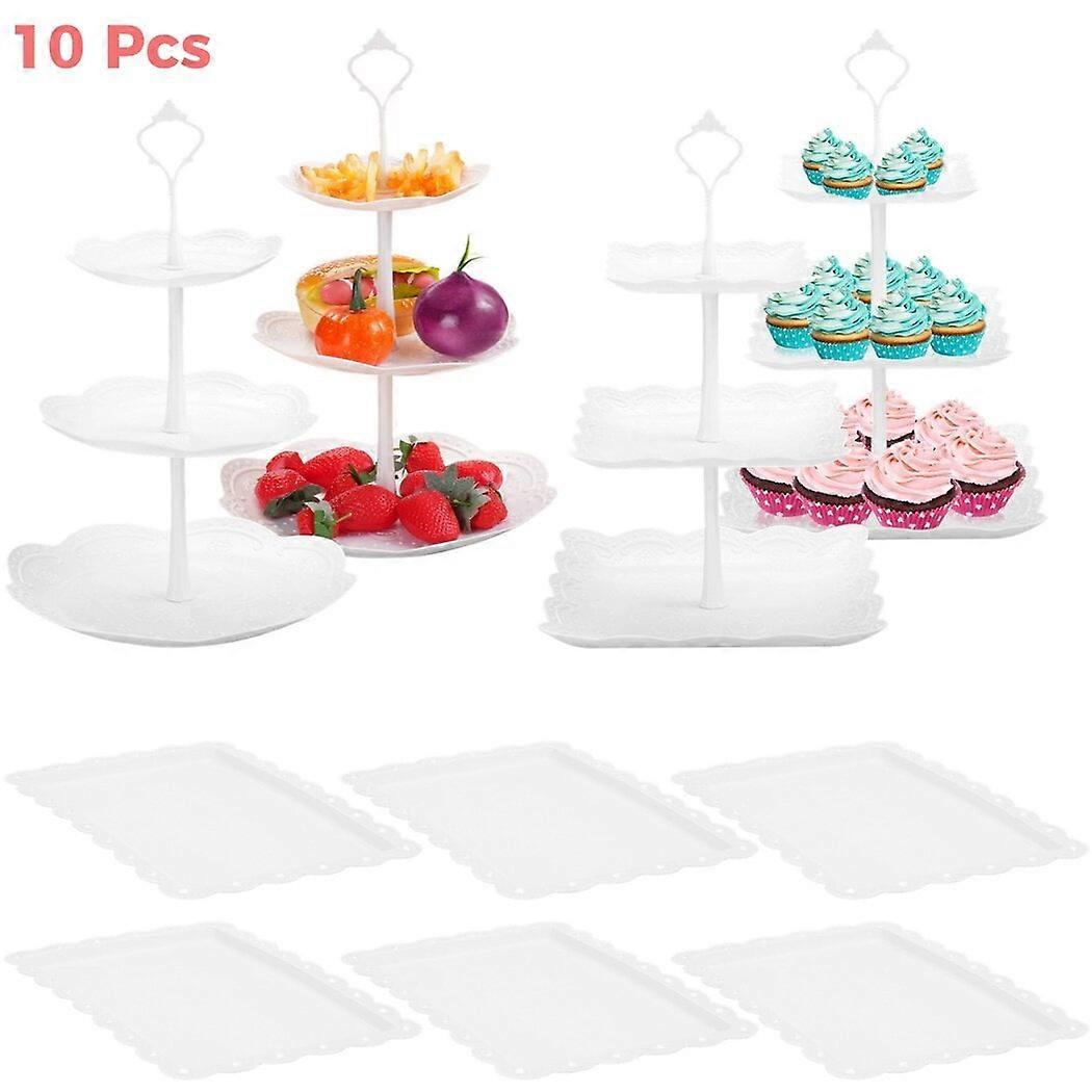 Color: White Material: Plastic Product Size: As Shown Package Includes: 6 x Square Plates, 2 Sets x Round 3-Tier Display Stands, 2 Sets x Square 3-Tier Display Stands Note: - Please refer to the measurement. A tiny measuring error is allowable in a normal range. - There might be a little color difference due to the monitor, camera, or other factors, please refer to the physical item. 【Complete 10-Piece Tray Set】You will get a 10-piece dessert table display set, which includes 4 3-tier cake display trays - 2 square and 2 circular, along with six rectangular plastic trays. With ample quantity and diverse variety, this set is perfect for catering to your daily dessert presentation needs. 【Elegant & Refined Design】Our dessert stands are designed with elegance and sophistication in mind. The combination of round and square shapes adds visual interest, while the 3-tier design optimizes space, allowing you to showcase more cakes or treats. The rectangular trays feature an elegant hollowed-out design, making your gatherings more attractive. 【Safe & Stable Plastic Material】Our dessert display set is made from quality plastic, ensuring fine craftsmanship and smooth edges. It is safe and odorless, lightweight yet sturdy, resistant to wear and tear, and not easy to break, deform, or fade over time. Rest assured, this set will provide you with long-lasting service and durability. 【Size for Easy Displaying】These square 3-tier cake stands are about 9.6 x 14.8 in, round 3-tier cake stands are approximately 10.6 x 15 in, and rectangular cupcake trays are about 14.4 x 9.3 in, providing ample space to hold 12-18 standard-sized cupcakes. Moreover, these stands offer sufficient height to showcase your beautiful frosted cakes. 【Versatile Applications】Our cake and dessert stands can be used as cupcake holders, dessert stands, or fruit displays. They are suitable for a wide range of events and parties, such as tea parties, baby showers, graduation, weddings, or even home decor. The versatility of this set allows you to elevate any occasion or space with its stylish presence.