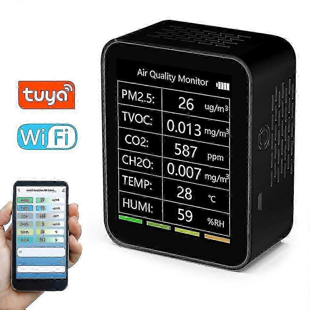 Tuya Wifi Portable Home Office Indoor Desktop Air Quality Detector 6 In 1 Multifunctional Detector Pm2.5 Tvoc Co2 Ch2o Temperature Humidity DetectingG