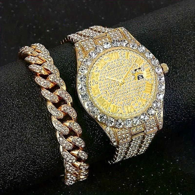 2pcs/set, Rhinestone Studded Calendar Ladies Quartz Watch And 1pc Rhinestone Jewelry Set
