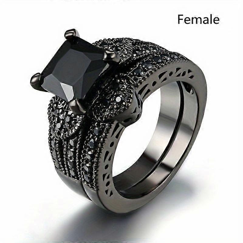 Fashion Couple Rings Women Black Heart Crystal CZ Rings Set Men's Two Rows Black CZ Stone Stainless Steel Ring Wedding Jewelry