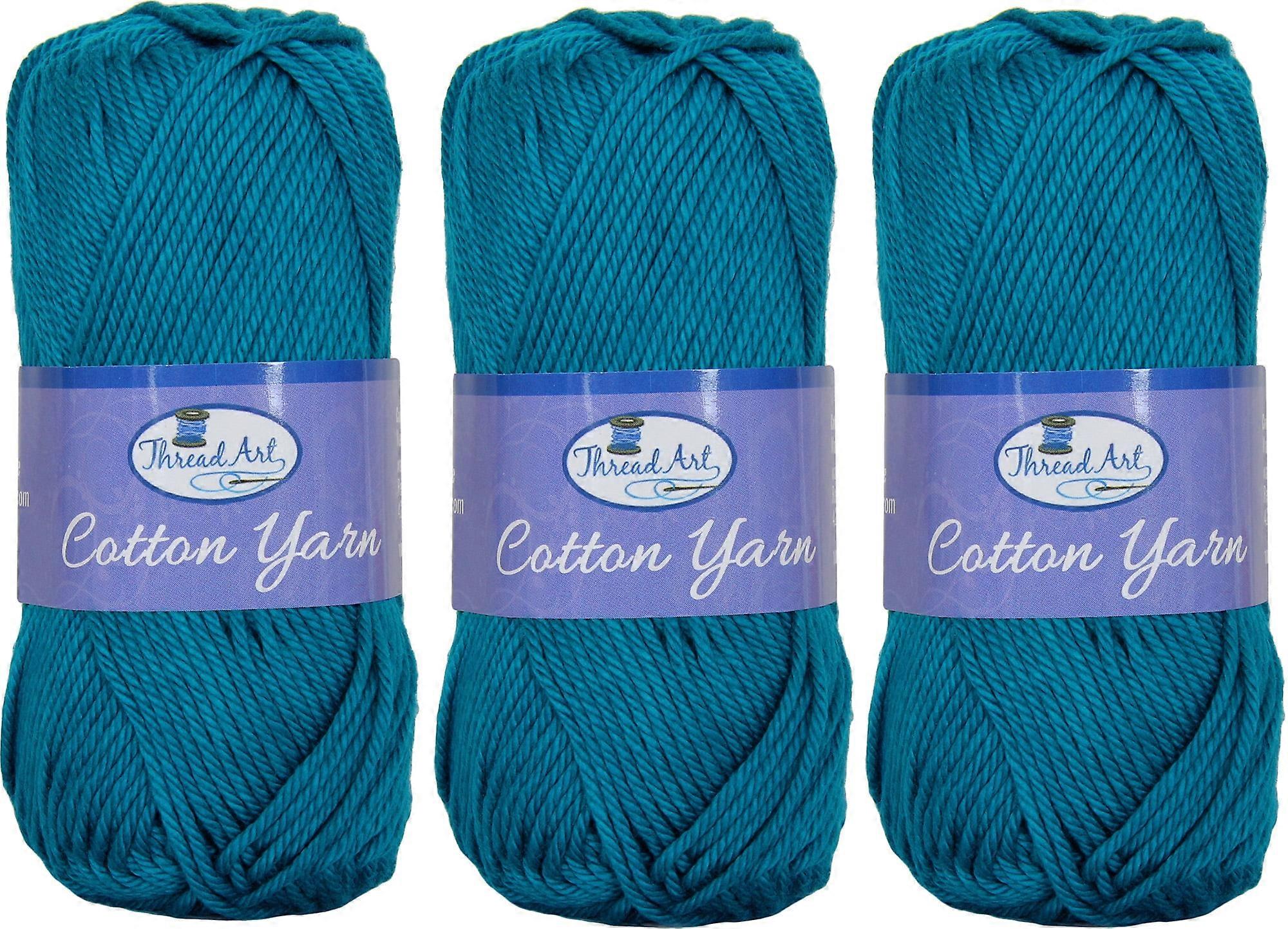 3 Pack of 100% Pure Cotton Crochet Yarn by Threadart | Teal | 50 gram Skeins | Worsted Medium #4 Yarn | 85 yds per Skein - 30 Colors Available