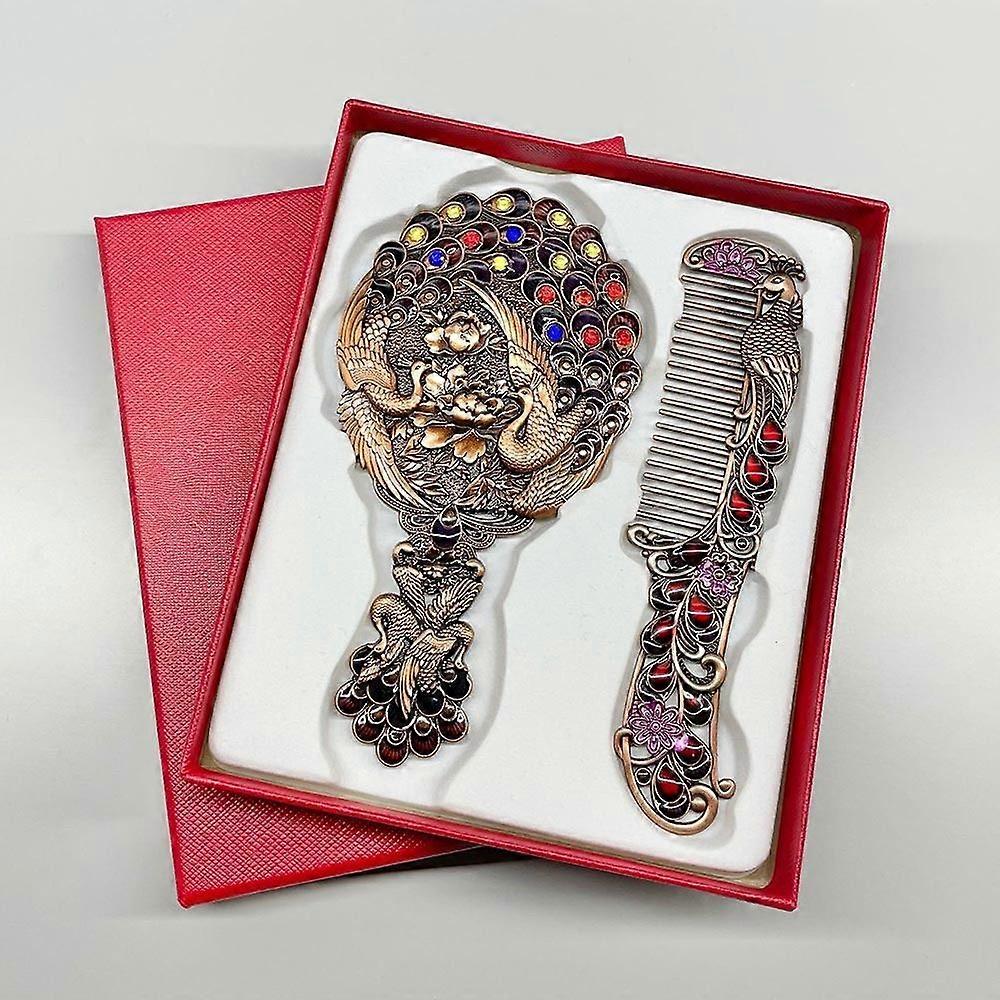 Retro Peacock Open Screen Small Mirror with Metal Handle Portable Vintage Handheld Makeup Cosmetic Compact Mirror Comb Gift