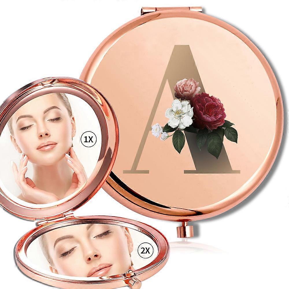 Women Folding Makeup Round Mirror Handheld Cosmetic Double Sided Mirror Metal Magnification Purse Look Glass Gold Letter Pattern