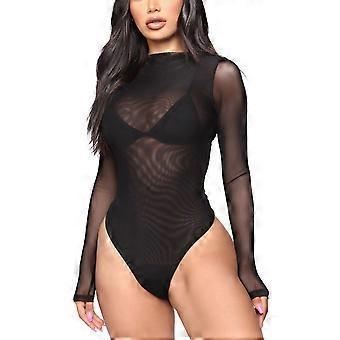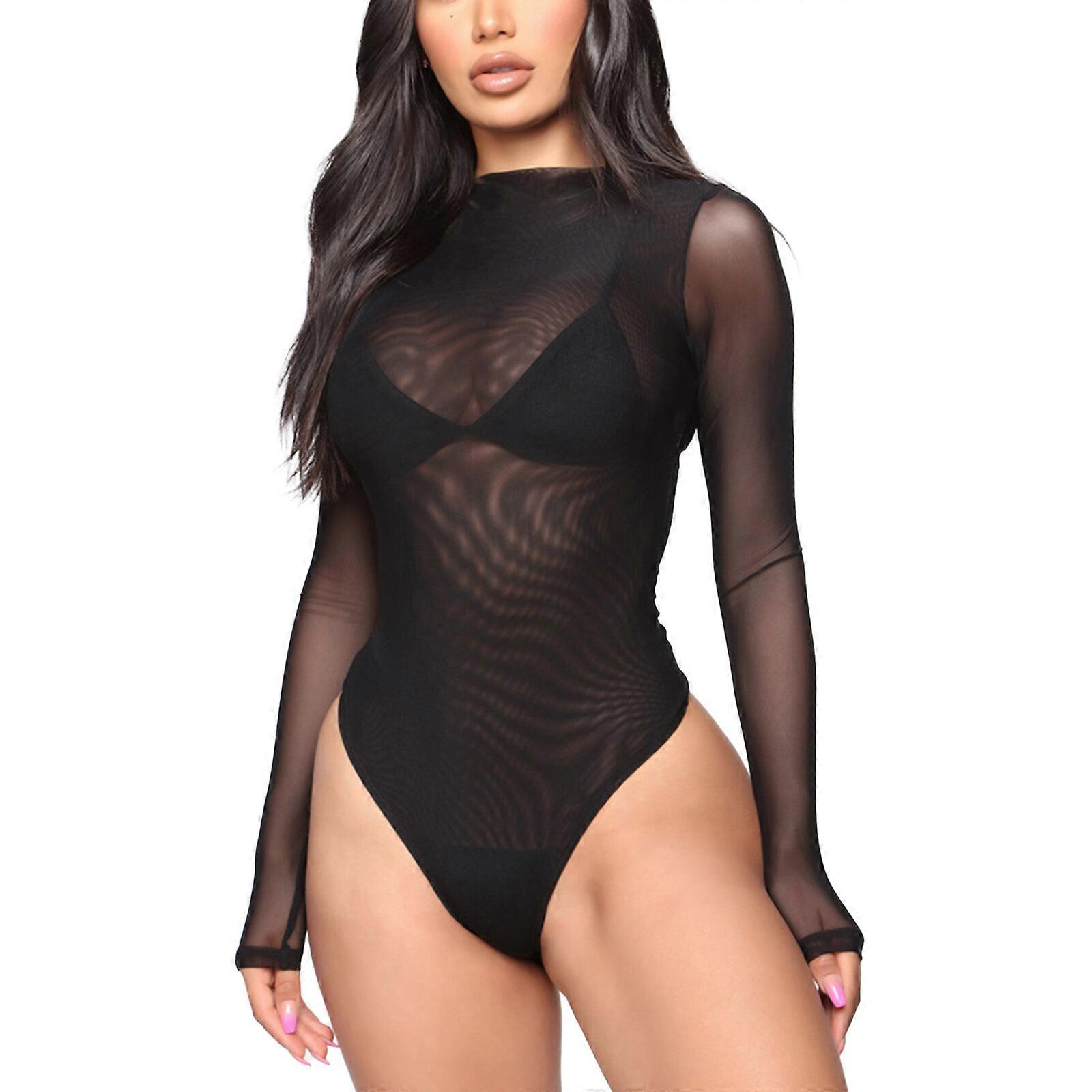 Womens Sexy See Through Mesh Lingerie Bodysuit Long Sleeve High Cut Leotard