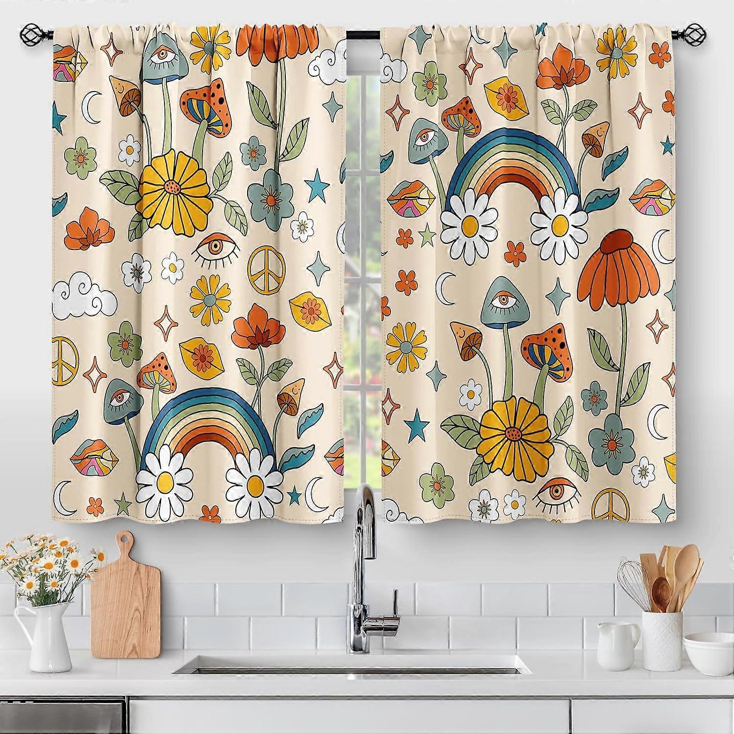 Retro Boho Mushroom Kitchen Curtains - Rustic 70s Hippie Fantasy Bohemian Floral Modern Colorful Short Cafe Tier Curtains 28"x36" 2 Panels