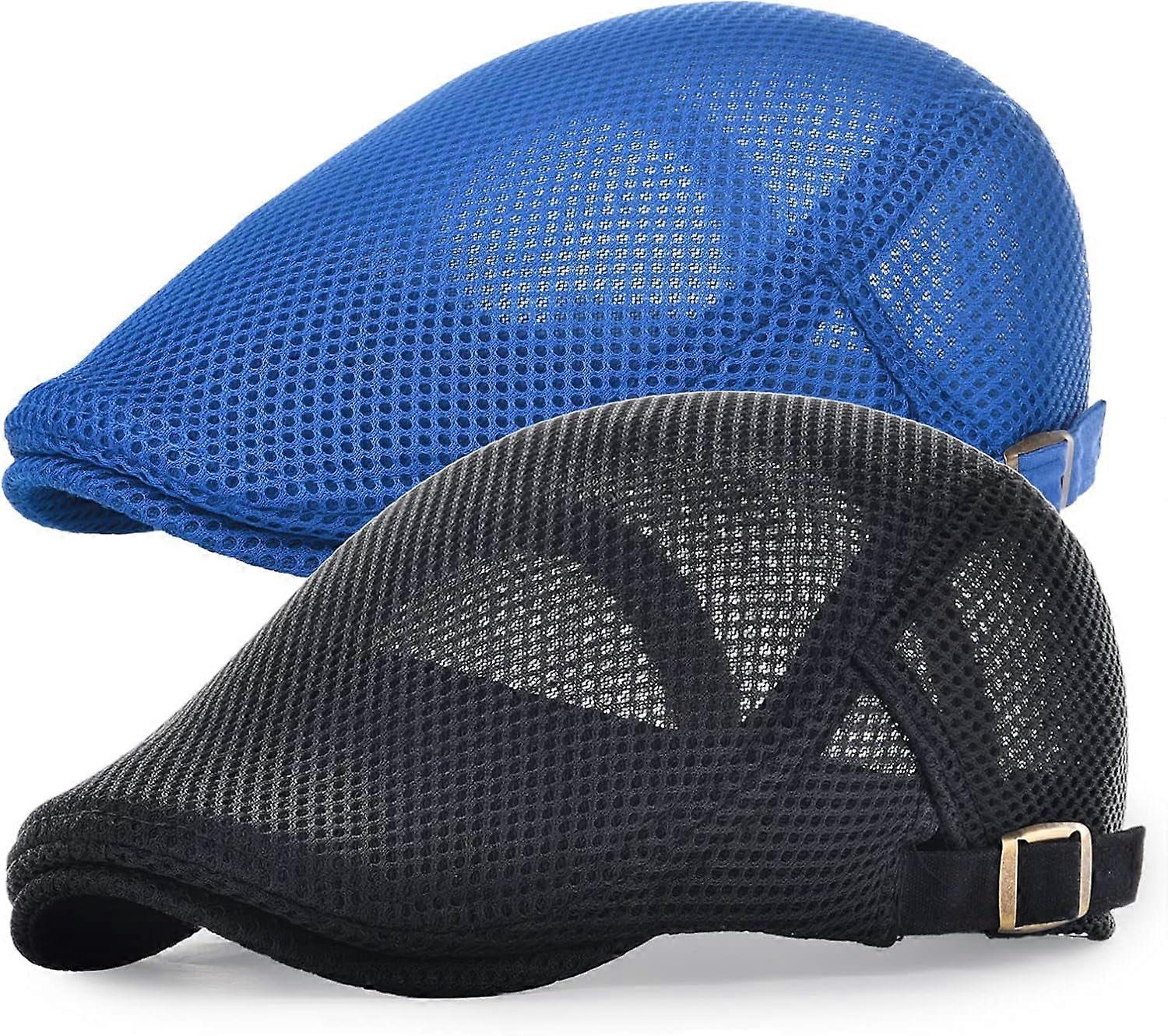 2 Pack Men's Mesh Breathable Newsboy Cap, Summer Cabbie Flat Cap Adjustable Driving Hat