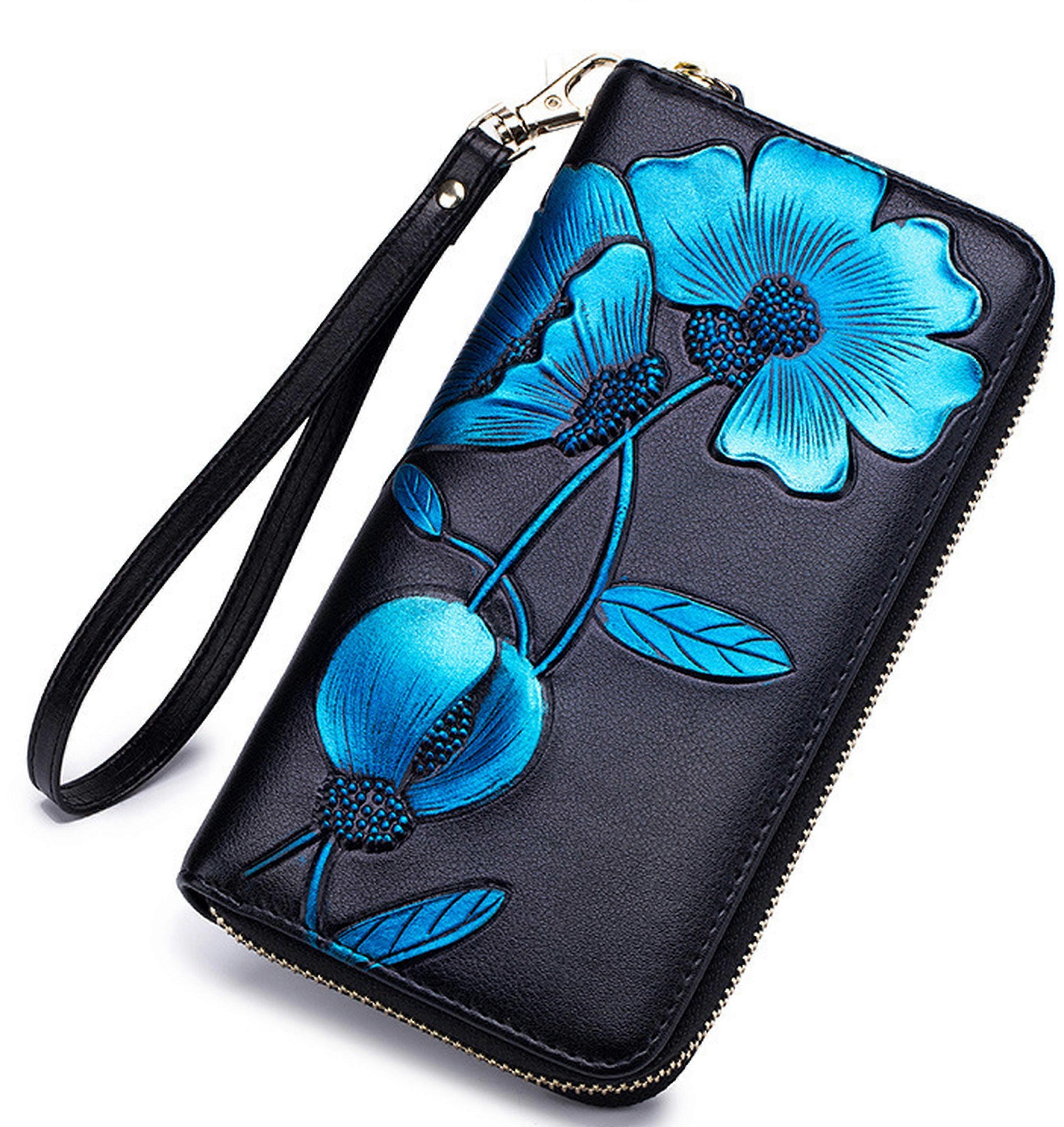 Ayli Large Capacity Women's Leather Floral Zip Around Cell Phone Clutch Wallet, Blue Flower