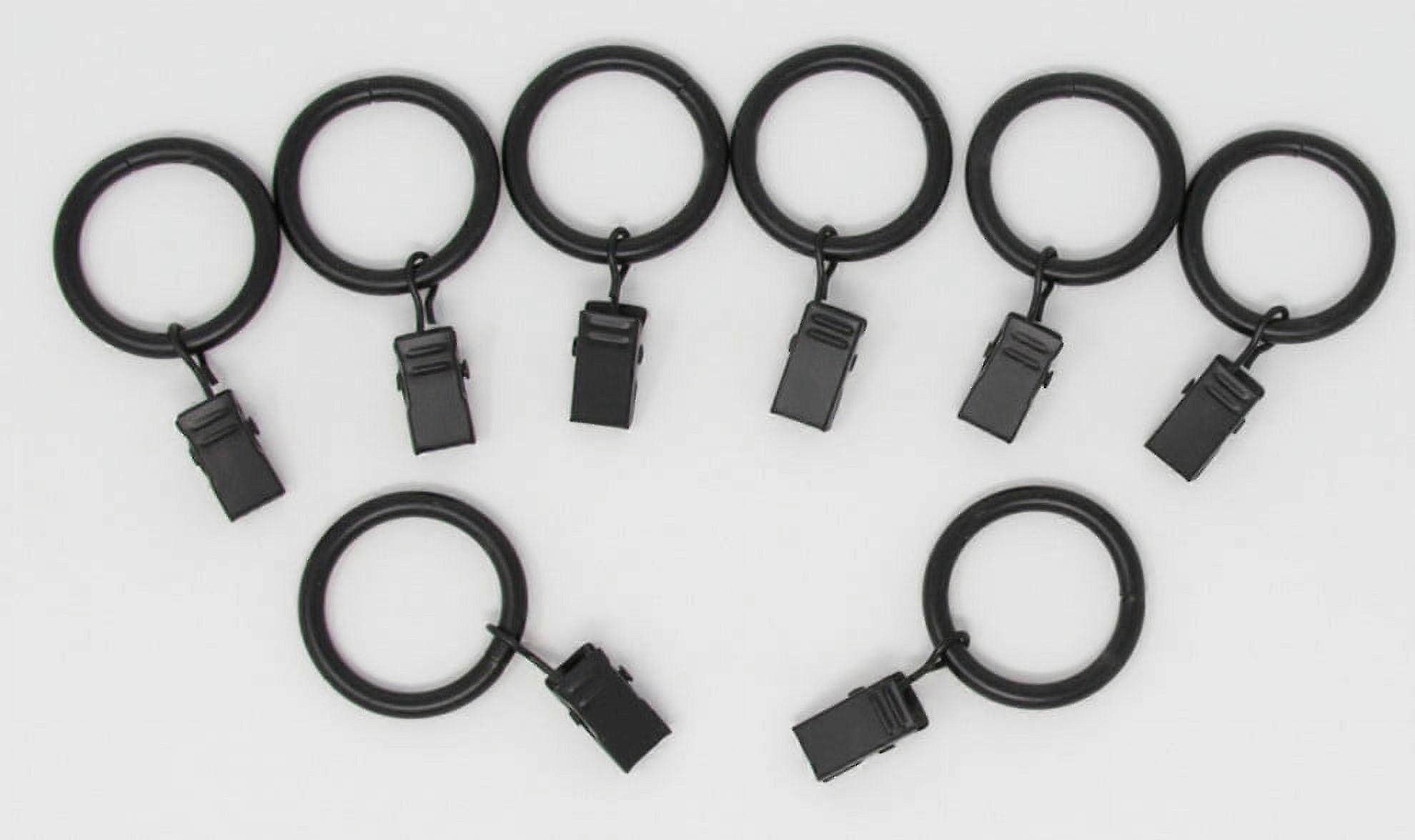 Solid steel curtain and drapery rings with clips1" inner diameter; compatible with 3/4 inch or 5/8 inch diameter rod setsClips can be removed for ring use onlyAvailable in the following finishes: Brushed Steel, Antique Brass, Matte Black, Glossy White, Bronze, Pewter, and Antique Gold