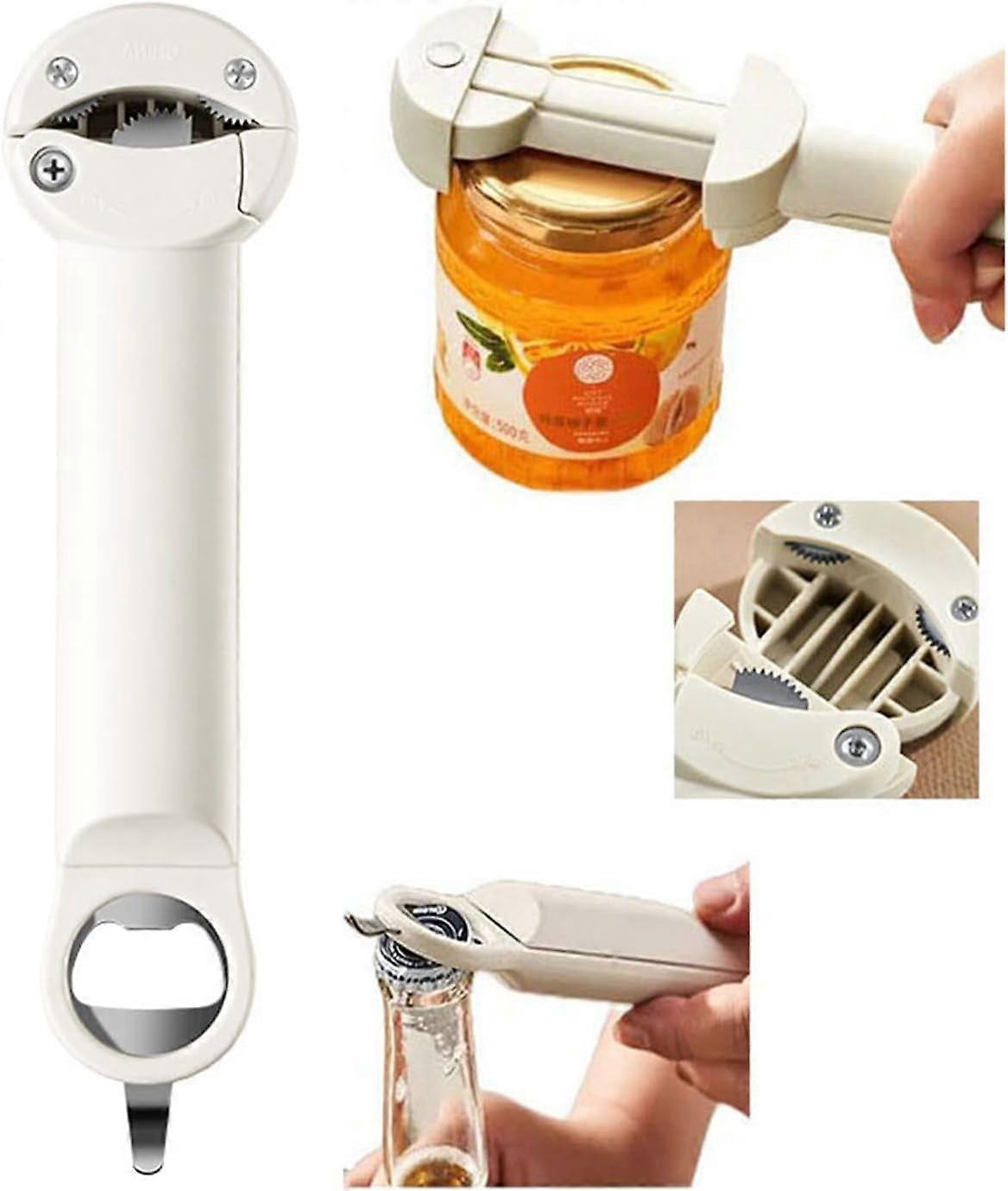 Stainless Steel Adjustable Cap Screwer with Retractable Bottle & Magnetic Can Opener, Multi Kitchen Tool for Jars, Wine, Beer (Off White)
