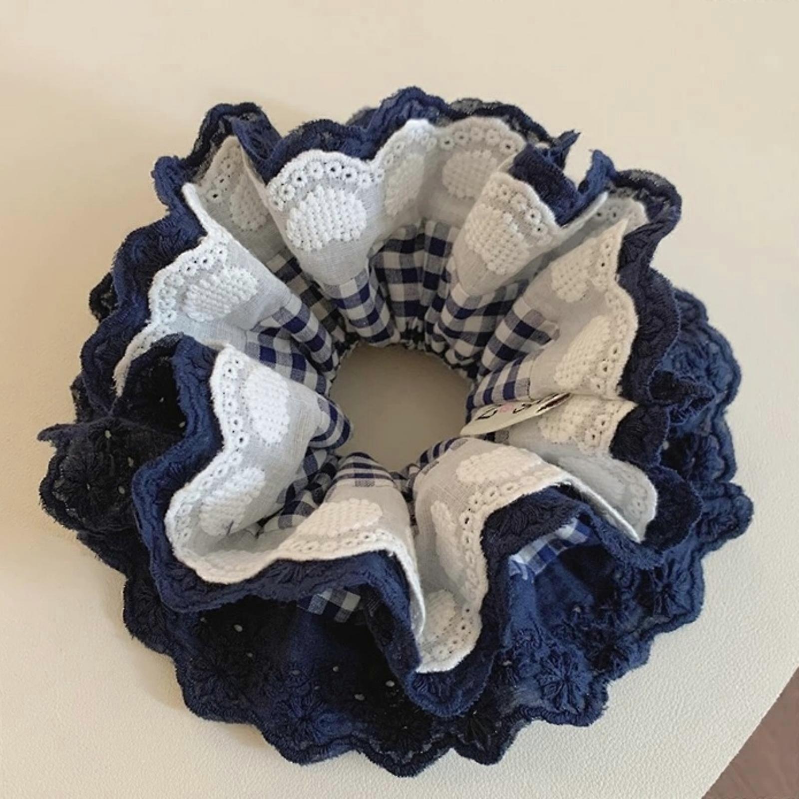 1PC Large Navy Blue Plaid Hair Scrunchie With Lace Trim, Chic Ruffled Hair Tie, Stylish Hair Accessory For Women