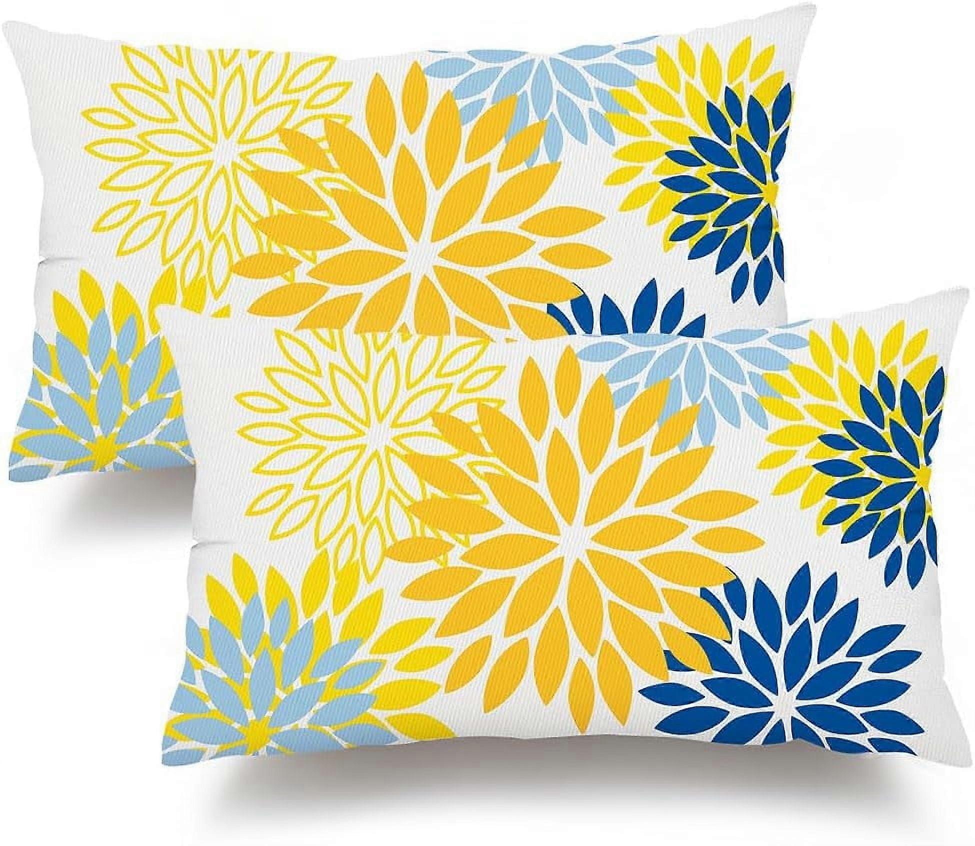 Yellow Blue Flower Pillow Covers 12x20 Inch Set of 2, Waterproof Outdoor Throw Pillows Compatible with Living Room Sofa, Patio, Garden Furniture,