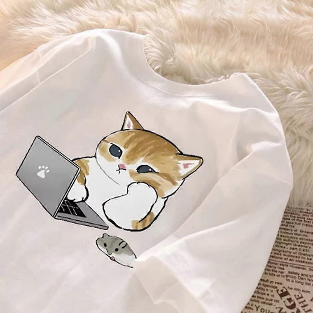 Cartoon Anime Working Cat Print Couple Short Sleeved Round Neck T-shirt - Summer Loose Casual Women's Top, Trendy Daily Wear