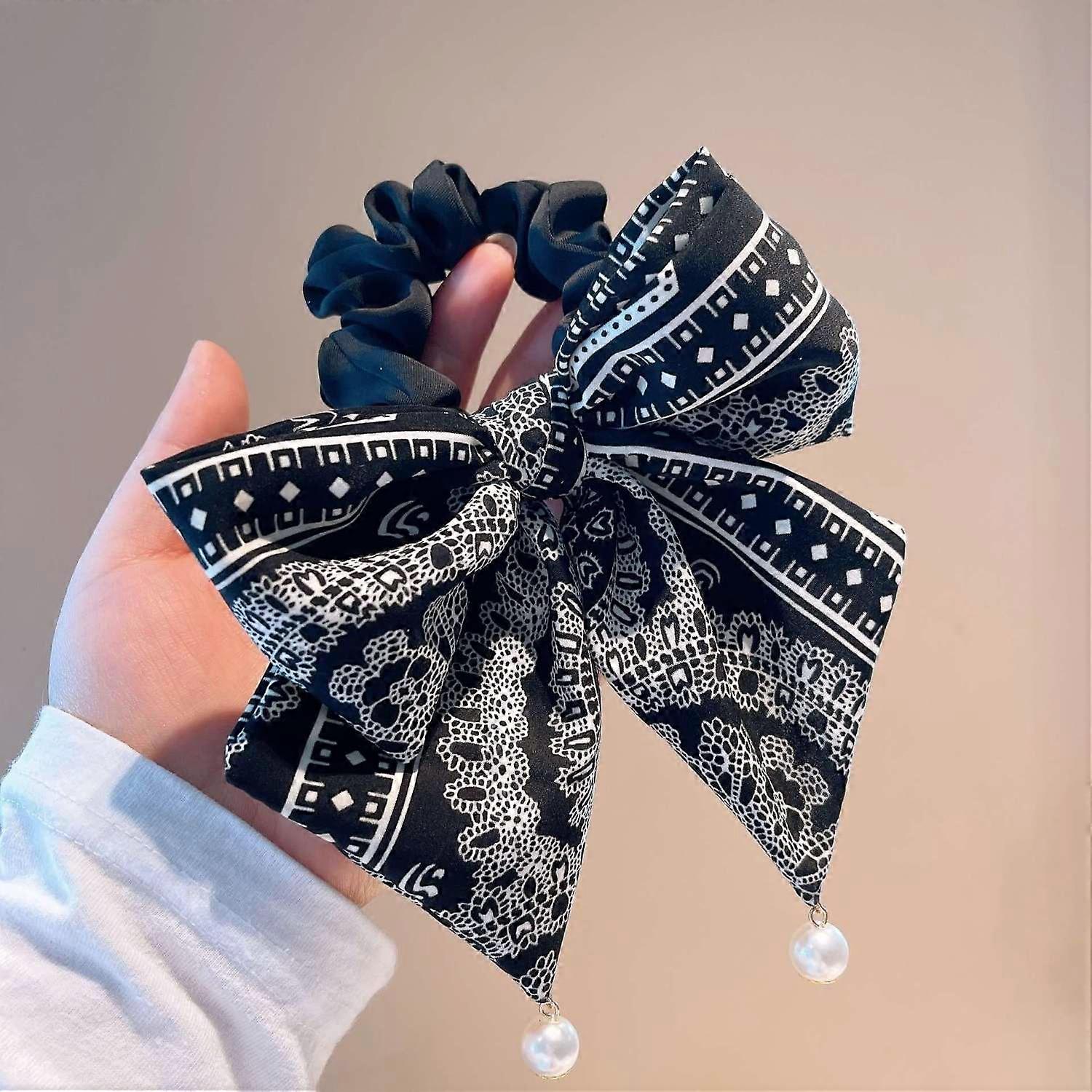 Fashion Women Paisley Oversized Bowknot Scrunchies Girl Elegant Pearl Ornament Hair Band White Black Satin Bun Hair Tie Headwear