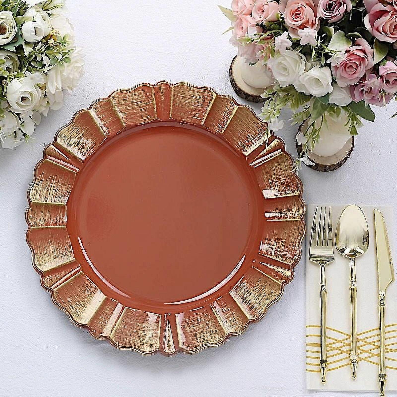 BalsaCircle 6 Terracotta Gold 13" Acrylic Wooden Textured Round Scalloped Trim Plastic Charger Plates