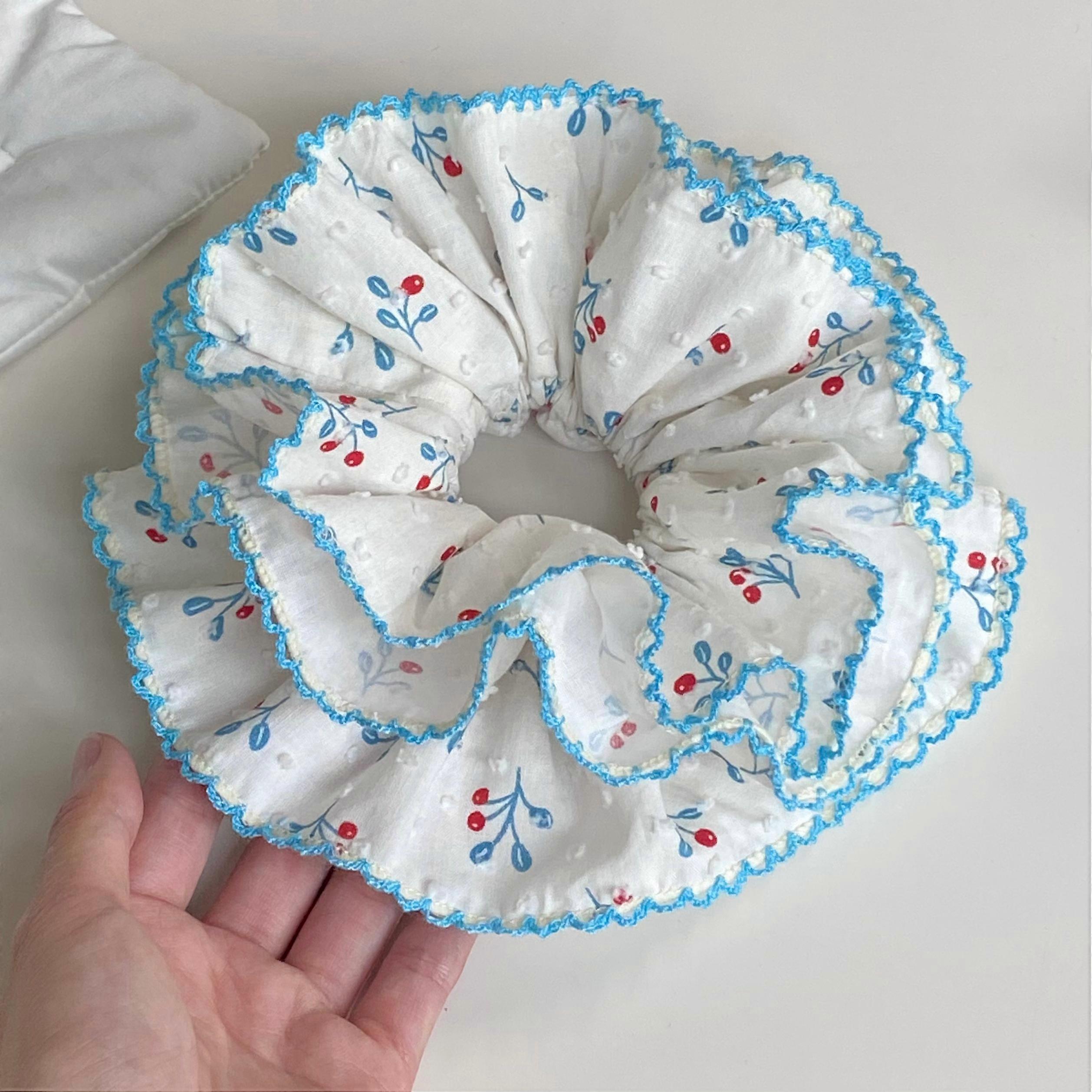 Retro Embroidery Blue Cherry Heavy Industry Four-Layer Scrunchie Women's Stylish Daily Hair Accessory For All Hairstyles