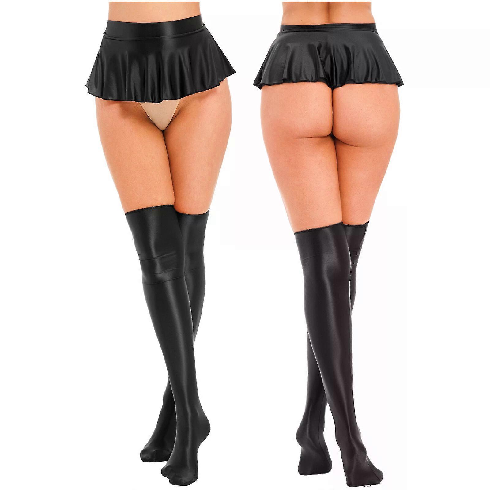 Sexy Women's Glossy Mini Skirt Wetlook Party Skirt Thigh High Stockings Clubwear