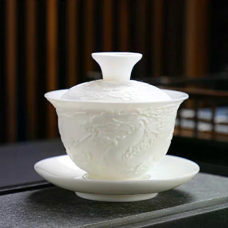 White Porcelain Kung Fu Tea Set White Jade Relief Tureen Ceramic Business Gift Simple Portable Dragon and Phoenix Cups Gaiwan