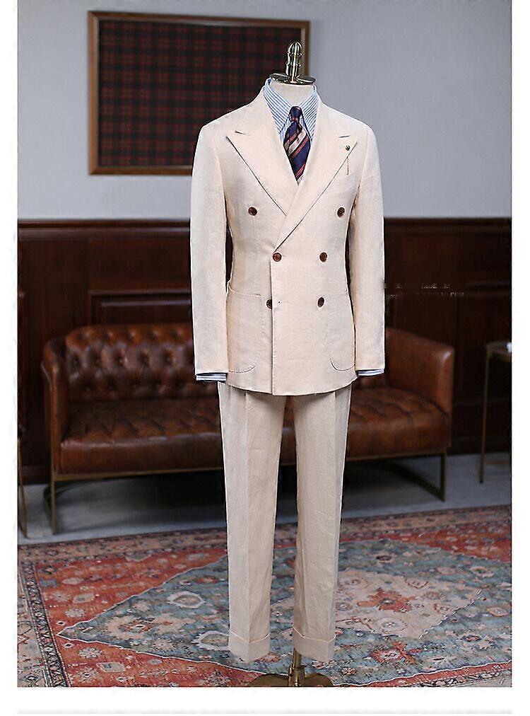 Summer Linen Men's Suits Double Breasted Jacket 2Pcs Daily Wedding Groom Tuxedos