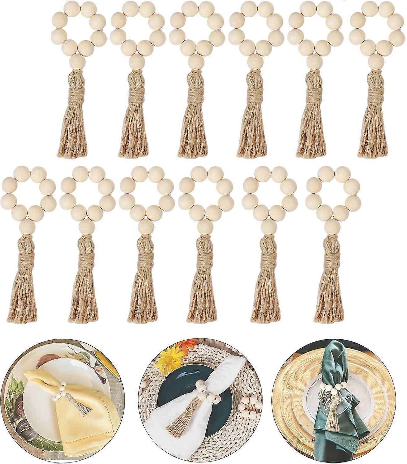6Pcs/12Pcs Wood Bead Napkin Rings Set, Elastic Boho Rustic Coastal Tassel Napkin Ring for Wedding Party Table Decor
