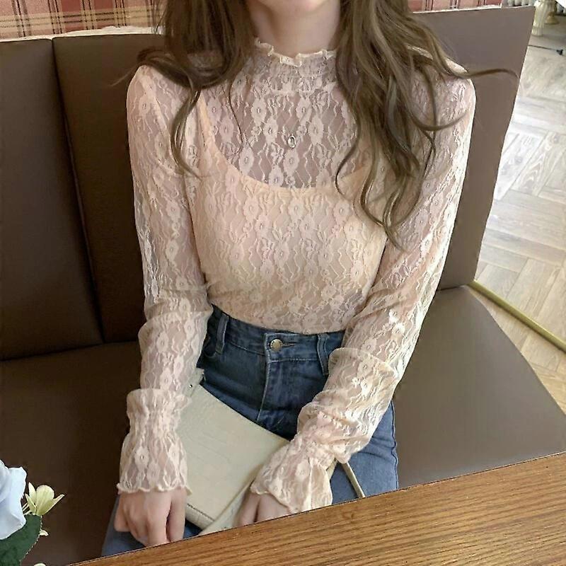 Ladies Floral Lace Tops Mesh Hollow Sheer Shirt Flared Sleeve Blouse Korean Sexy