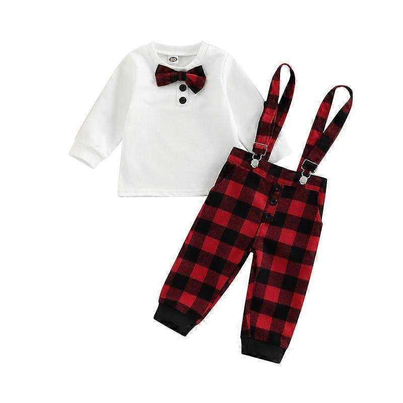 Newborn Infant Baby Boy My 1st Christmas Clothes Set Long Sleeve Bow Shirt Plaid Print Suspender Trousers Outfits Xmas Costume