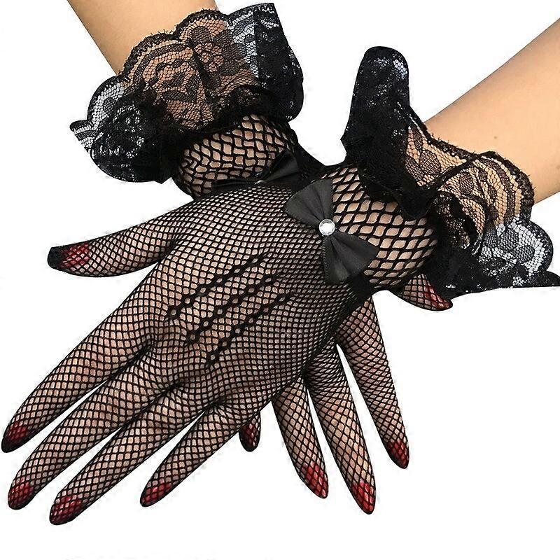 Allacki Lace Bowknot Mesh Gloves Sheer Wedding Elegant Gloves for Prom