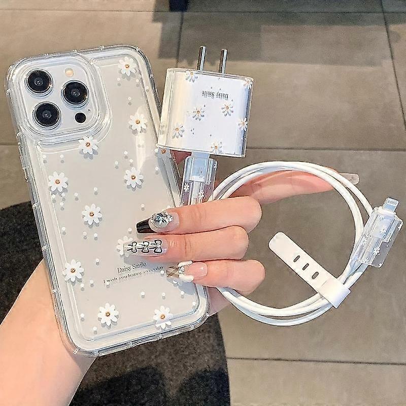 Daisy Flower Pattern Phone Case with Charger Saver & Data Cable Protector & Storage Rope, Decorative Phone Protector Cover for iPhone, Casin